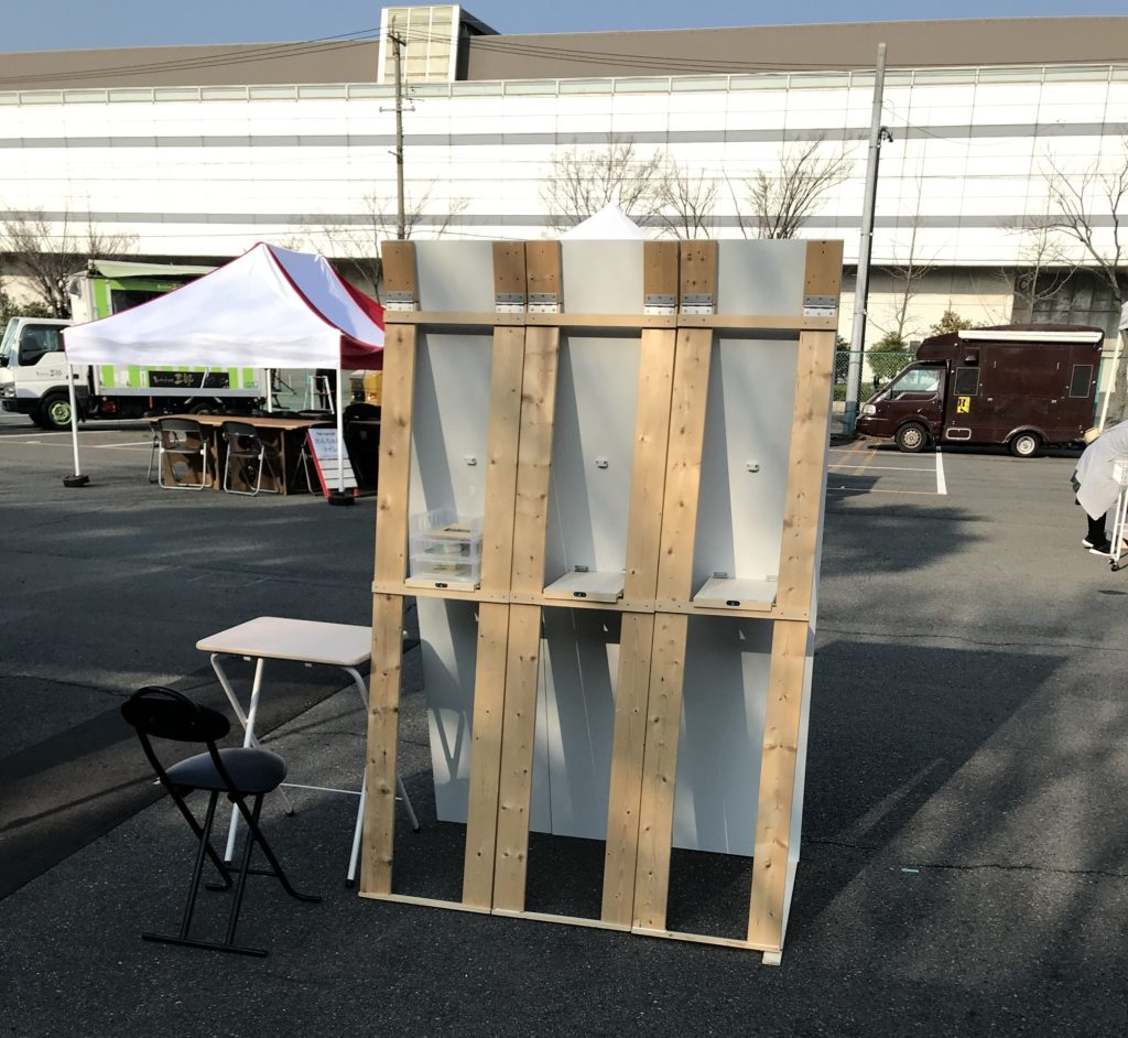 こちら正面から、奥の黒い軽自動車が僕の車なのですが写真で見て貰えば分かりやすいんだけどブースの奥に自分の車が停車できるシステムなんです。この形は荷物出すのに非常に便利でしたし近くに車がある安心感って結構大きかった。