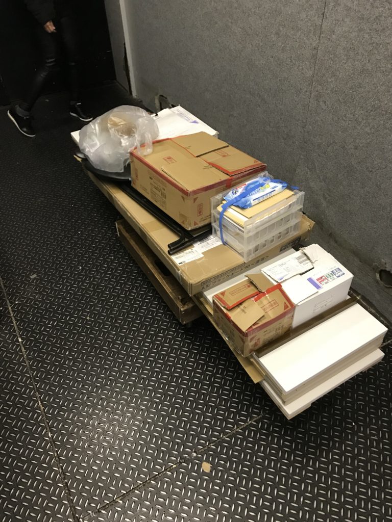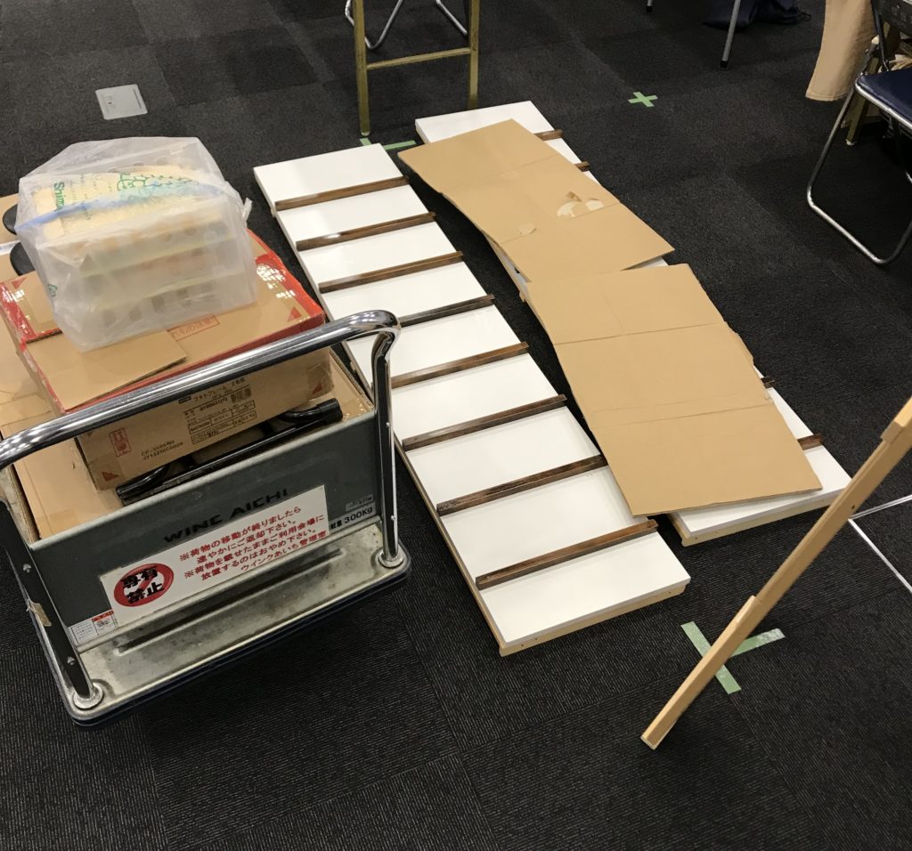 まだほとんど誰も来ておらず悠々と荷下ろし。何往復かしないといけないなって思っていたら車も運べそうなエレベーターを使ってくださいと親切なスタッフの人が教えてくれて一発で会場のある7階まで運べました。この段階でドライバーさんは車を搬入口からどけないといけないため帰宅していただきました。