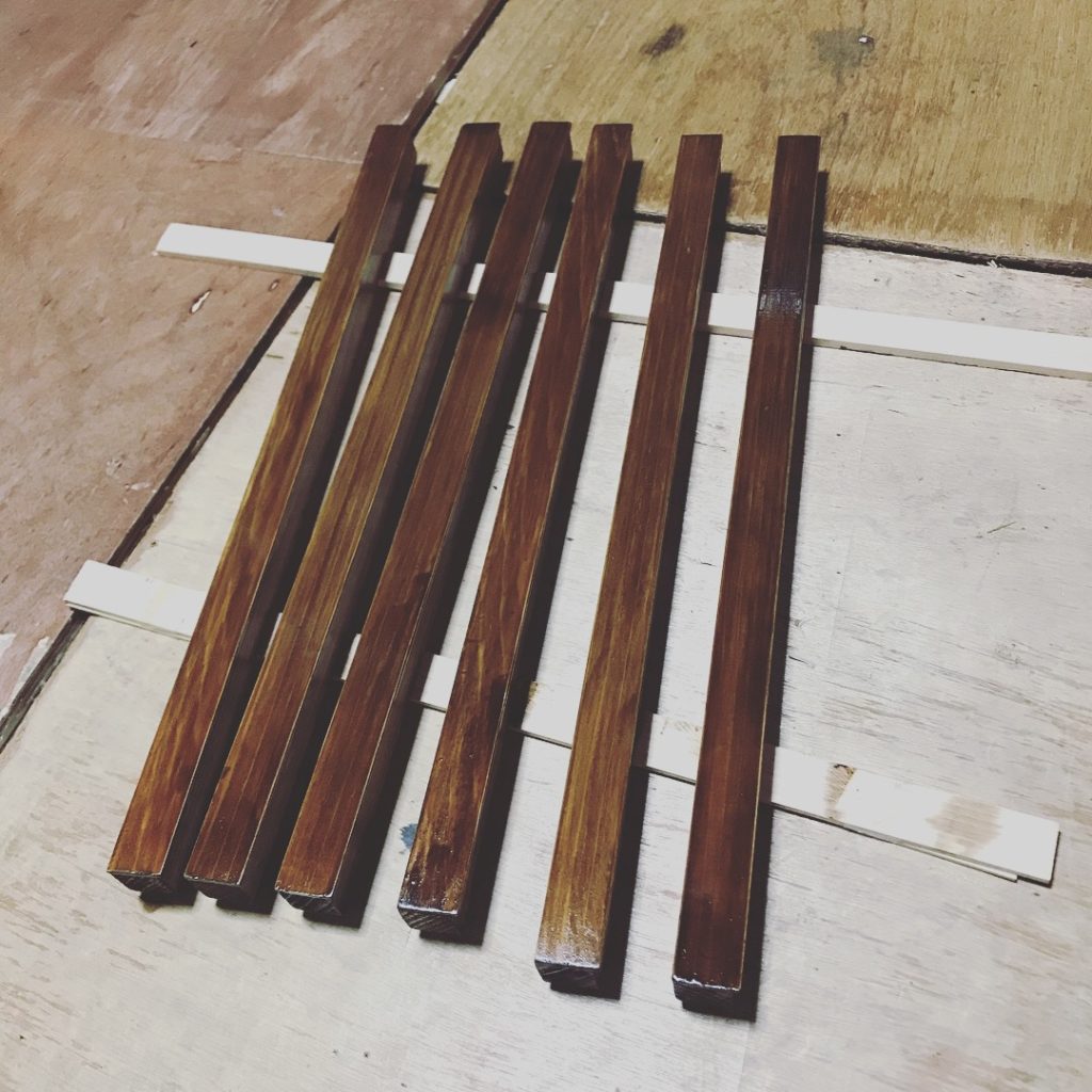 そして段を増設するために棚を作る。一台につき六段だった棚を二つ増やして八段にします。最初の時に作った作り方を忘れてしまい一から考える。元々のやつを計測すると18㎜の角材に20㎜の平板を貼り付けてあることがわかった。その二㎜の差が棚の受けになっている。あと困ったのはペンキ。これはもう前の容器が残っていなかったため「きっと昔の俺が使ったペンキはこれだ!」とやって試すしかなく購入。結果正解でした。ウレタンニスのエボニーを三回塗りです。