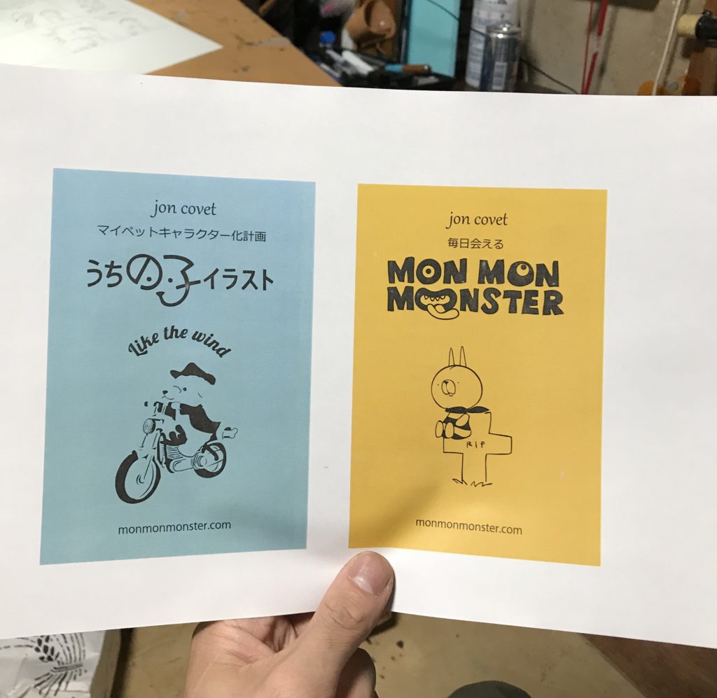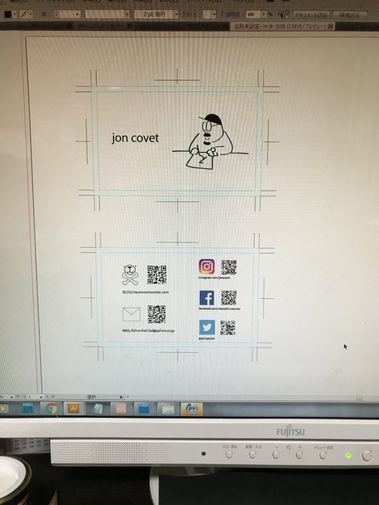 あとは名刺を作る予定だがこちらは説明の手間を省きたいので全SNSを載せる。こちらもデザインは極めてシンプル。Facebookのページを個人のものかMON MON MONSTERのページ どちらを掲載するかの答えが出ず昨日の入稿ができなかった。