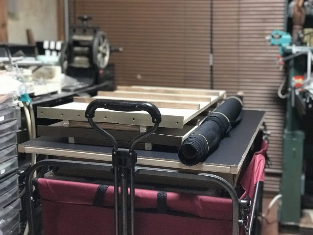 まずはこちらが収納された状態の全体像。車から会場までの搬入スタイル。一回で済むように計算して作った。以前のブースは多い時で4、5回運んでいたのでかなりの時短になる。