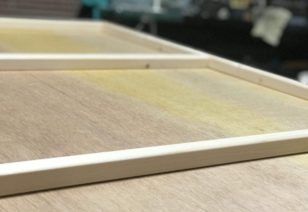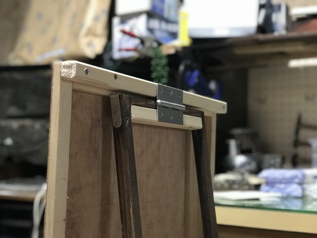 机の上に展示台を乗せて什器の設置は完了です。この展示台のみ以前のブースから引き継いで使います。立つように裏に蝶番をつけました。いい感じです。