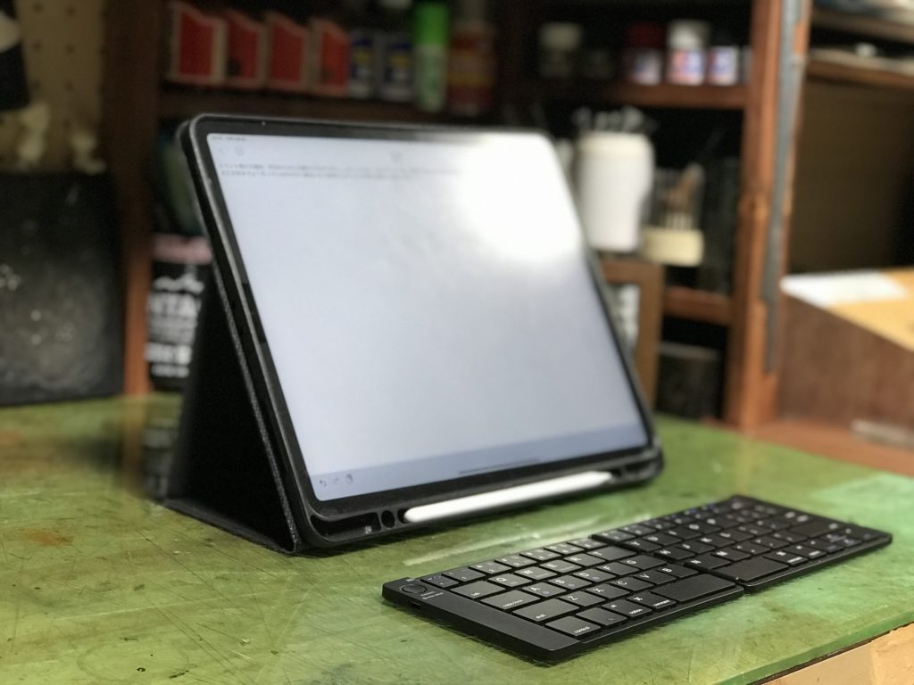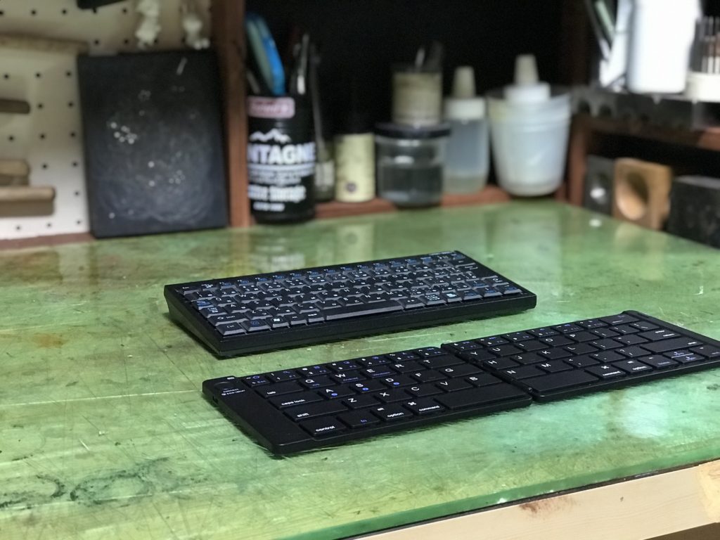 今回折りたたみ式の物にしてみた。結構高級感もありコンパクトでかっこいいんじゃないかと思う。以前のものと比べても開いた状態のキーボードは大きくそれだけで打ちやすそうな安定感がある。