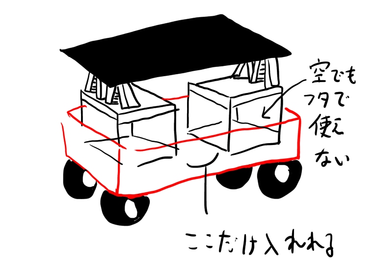 あと今はキャリーワゴンをテーブル化している。中に入れてある荷物入れのケースを足場にしている、これだとテーズルスタイルに変化させると中に荷物を入れられないので外に出さなくてはいけない。これが大きな欠点で困る場面続出だったので改造したい。