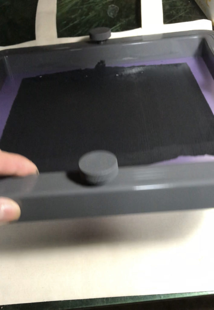 スクリーンは細かいメッシュになっている。その上に紫の膜が薄く貼られている。それは水に溶け光で固まる性質がある、そこに黒いイラストを置くとそこだけ光を通さない、すると感光した部分は固まり光を通さなかった黒いイラスト部分だけは水に溶けるのでスクリーンにはイラストの形が残る。そこはメッシュになっているのでインクを流すと描いたイラストのままプリントすることができる。