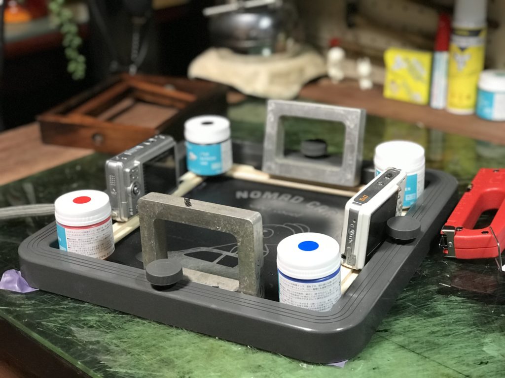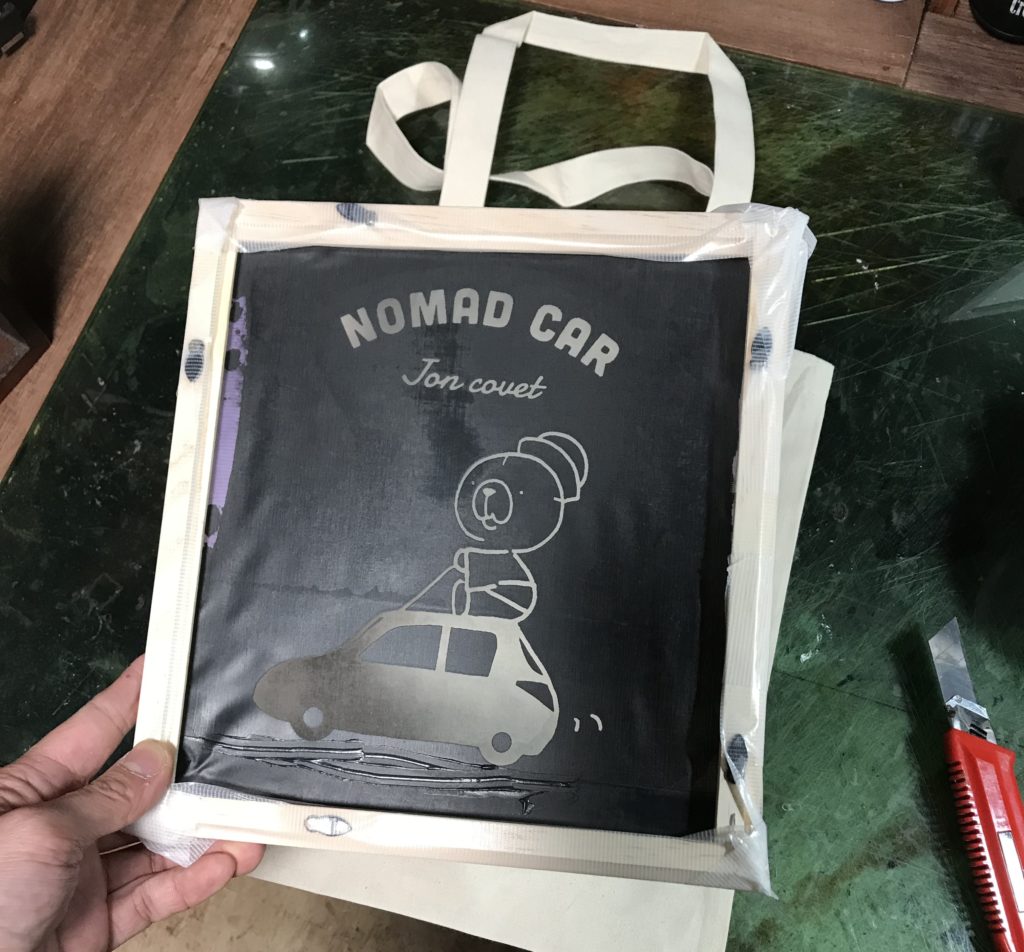 シルクスクリーン印刷で最初に専門の枠を使い版を作る。非常に優れた作りで簡単にスクリーンをピンと張ることができるので版を作ることができるが次の作品を作ろうと枠から取ると張りが解けて、次の使用がでできなくなる(し難くなる)あと枠が固まってしまうため丸洗いができないのも手間なのでピンと張ったまま別の枠に移すことにした。