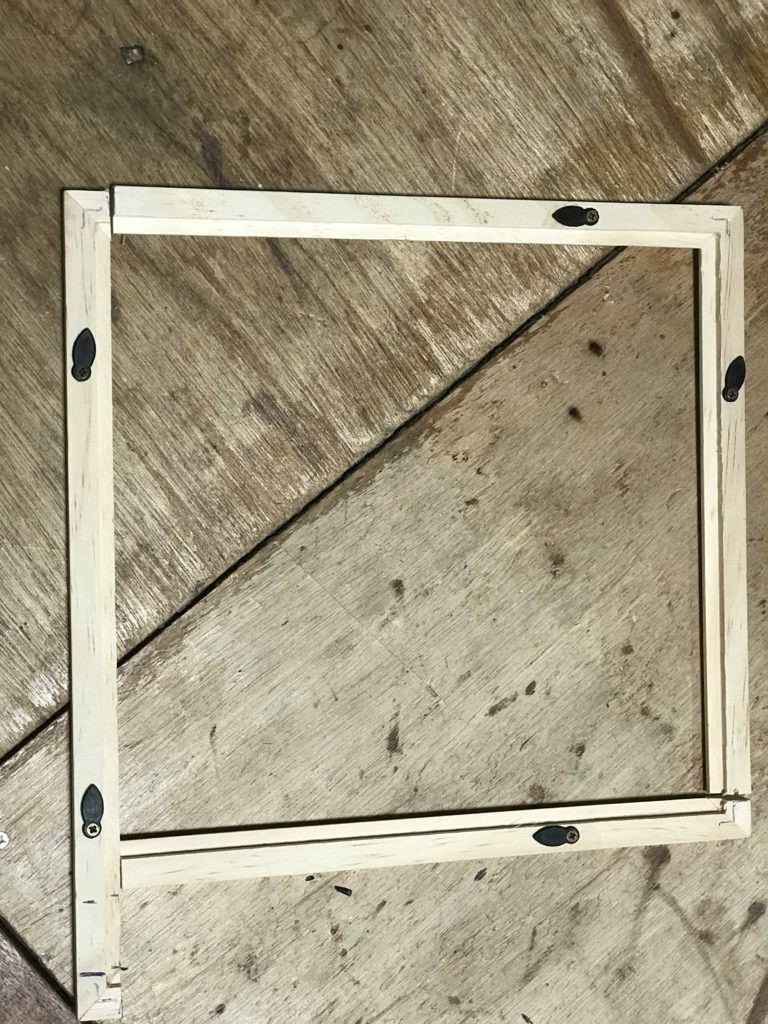 100均の木枠をノコギリで切って小さくして枠よりもひと回り小さくしてボンドで貼りつけ十分に固まってからカッターで切り離してみた。