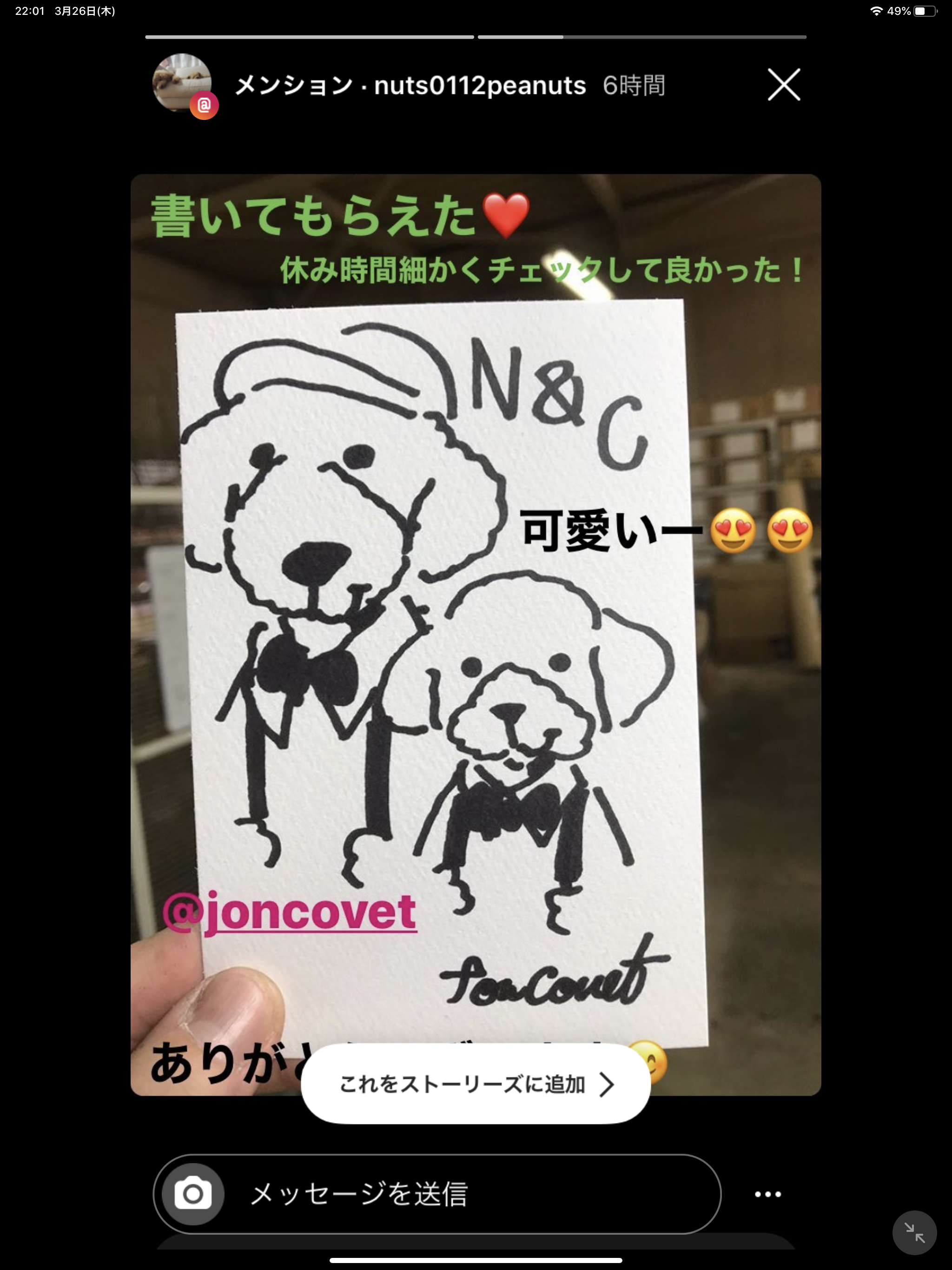ご自身のストーリーズに@joncovetと打ち込んで投稿してください。そちらをぼくのストーリーズに追加させてもらいます。