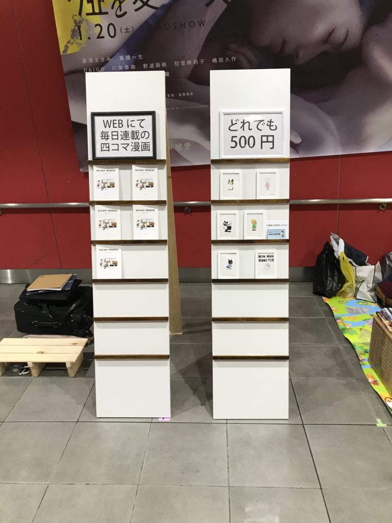 椅子を忘れ、やたら低いスノコに腰掛け風が吹き荒ぶ渡り廊下であまりの寒さに毛布をかぶりながら外国の家族の方達が服を売る横でその場で描いたイラストを売っていたところからスタート。