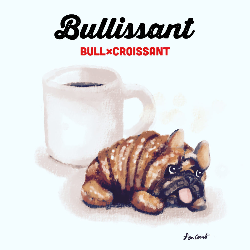現在絵本コンテストに挑戦中の「パン屋さんの犬」。エントリー期間中の特別企画としてイラストを描いています。そんな中、食パンのコーギーの他に何か犬をパンにできないかと考えクロワッサンの巻いて段になっている部分をいかしてフレブルにしてみた。