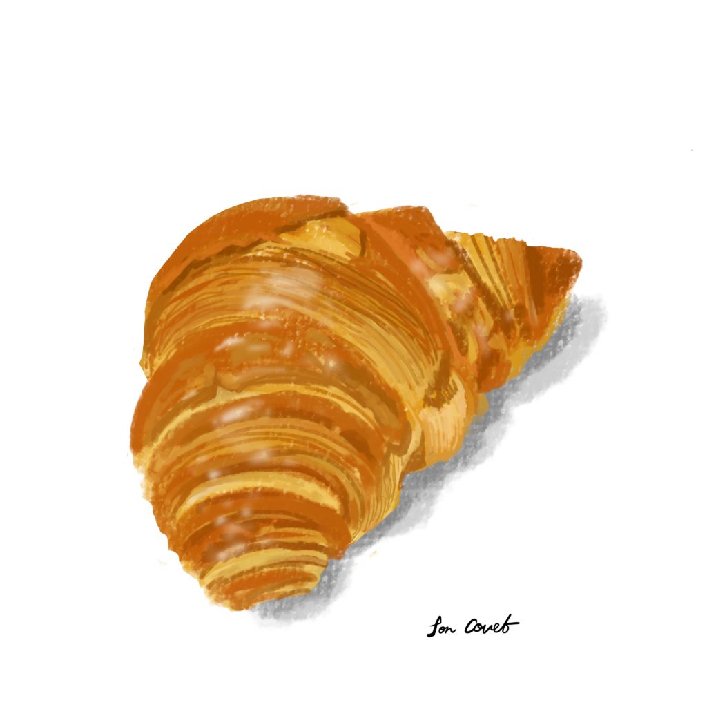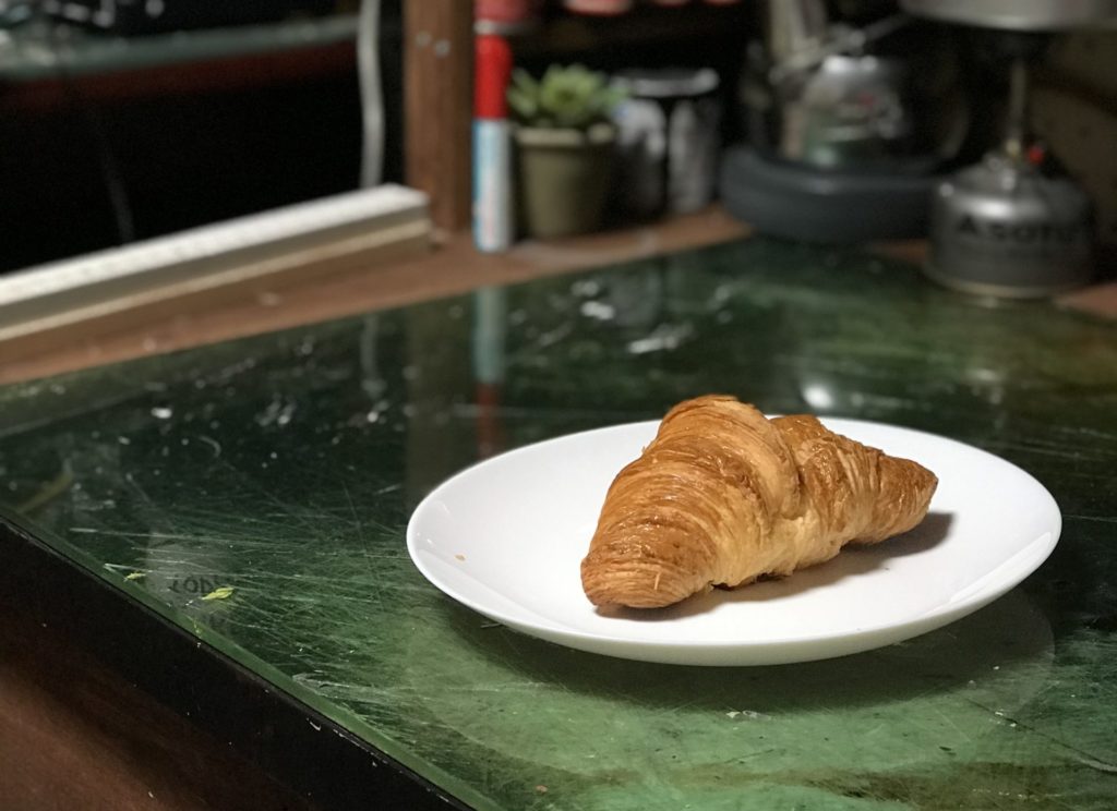 まずは観察。皮が剥がれてしまうので皿に乗せてクルリと回す。断面の層が自分が思っていたよりも重ねて巻いてあった。その層全てに熱が入りパリッとしている。パンで大切なコゲ感は表皮が文字通り完全に焦げて出しているあたり食パンよりもカリッとしている。