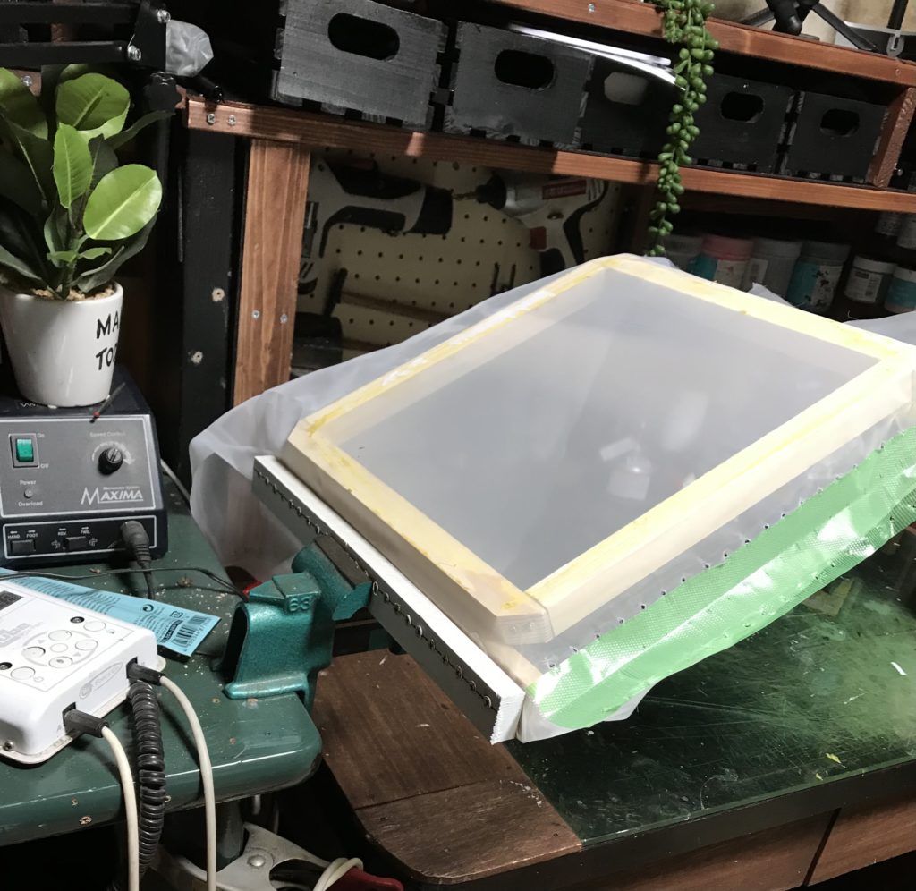 停滞していた紗張り問題ですが前回作った紗張り機を万力で固定してテンションをかけたら上手くいきました。やってわかりましたがYouTubeを参考にした前までのやり方だと単純に強くテンションがかかりすぎているだけだったみたい。木枠まで引っ張られて割れていたのであれはやりすぎ。その人のやり方が間違っているわけではなく手作りした機器の違いだったんだと思います。