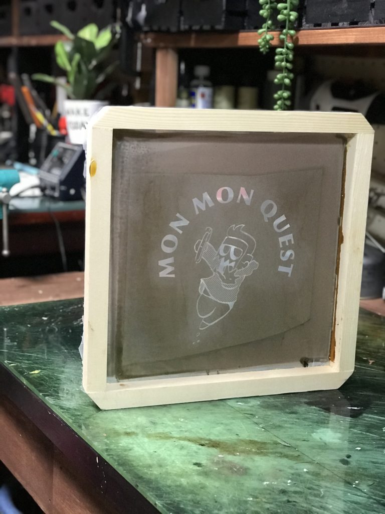 Tシャツくんの会社が販売している露光剤がすでに塗ってある専用の紗(シルクスクリーン)で作るのならなんの問題もないんだけどぼくは作った版をそのまま保持しておきたかったので木枠に自分で紗をはり露光剤を塗るというもはや簡易キットの枠から出てしまい、そのことが新たに問題を生み出す結果となりました。そう完全にぼくが勝手に生み出した問題です。