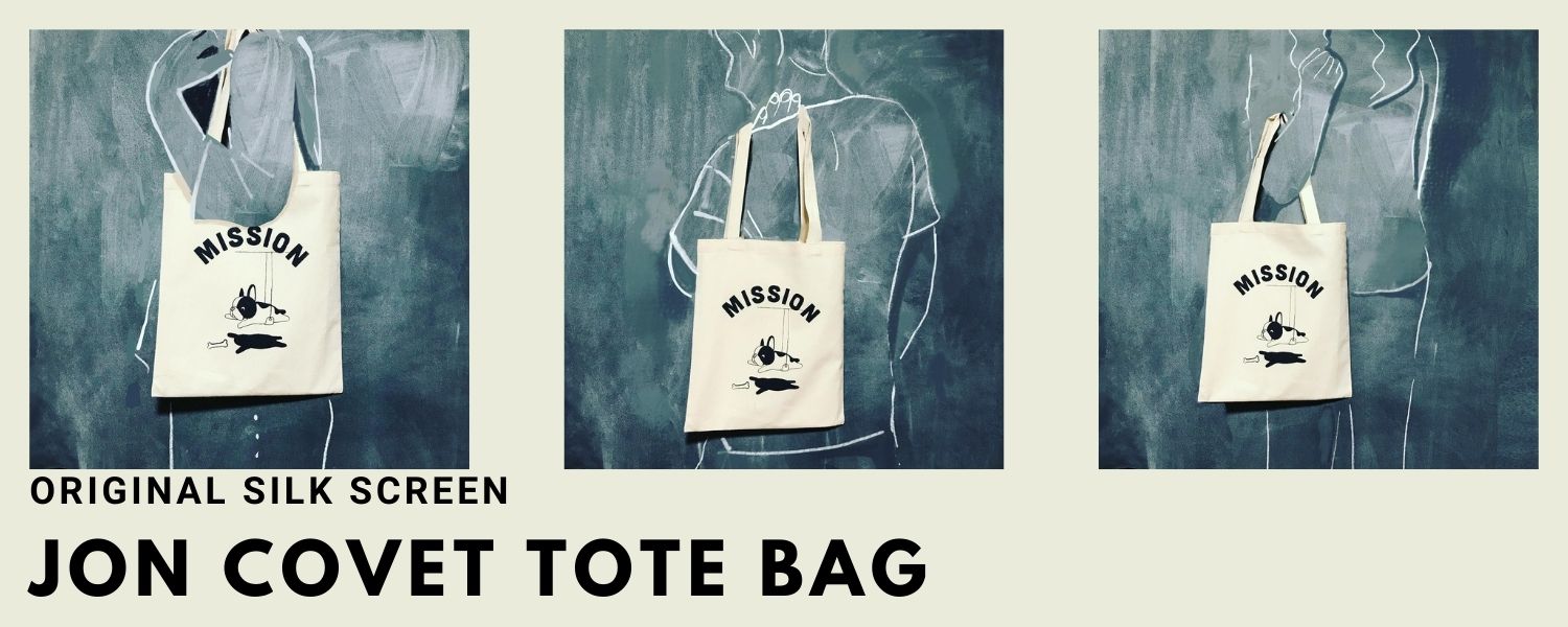 そんなこんなで着実に進んでいるシルクスクリーン。先程ようやく作ったバッグの第一弾をWEBショップ「jon covet gallery」にて販売開始しました。背景とモデルは前に思いついたアイデアの「黒板モデル」