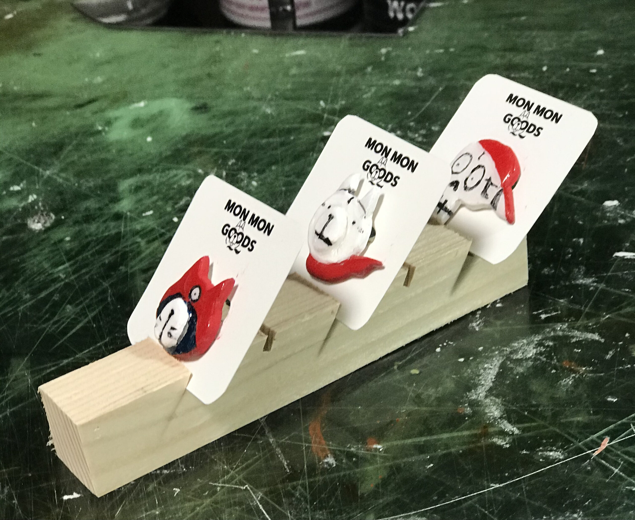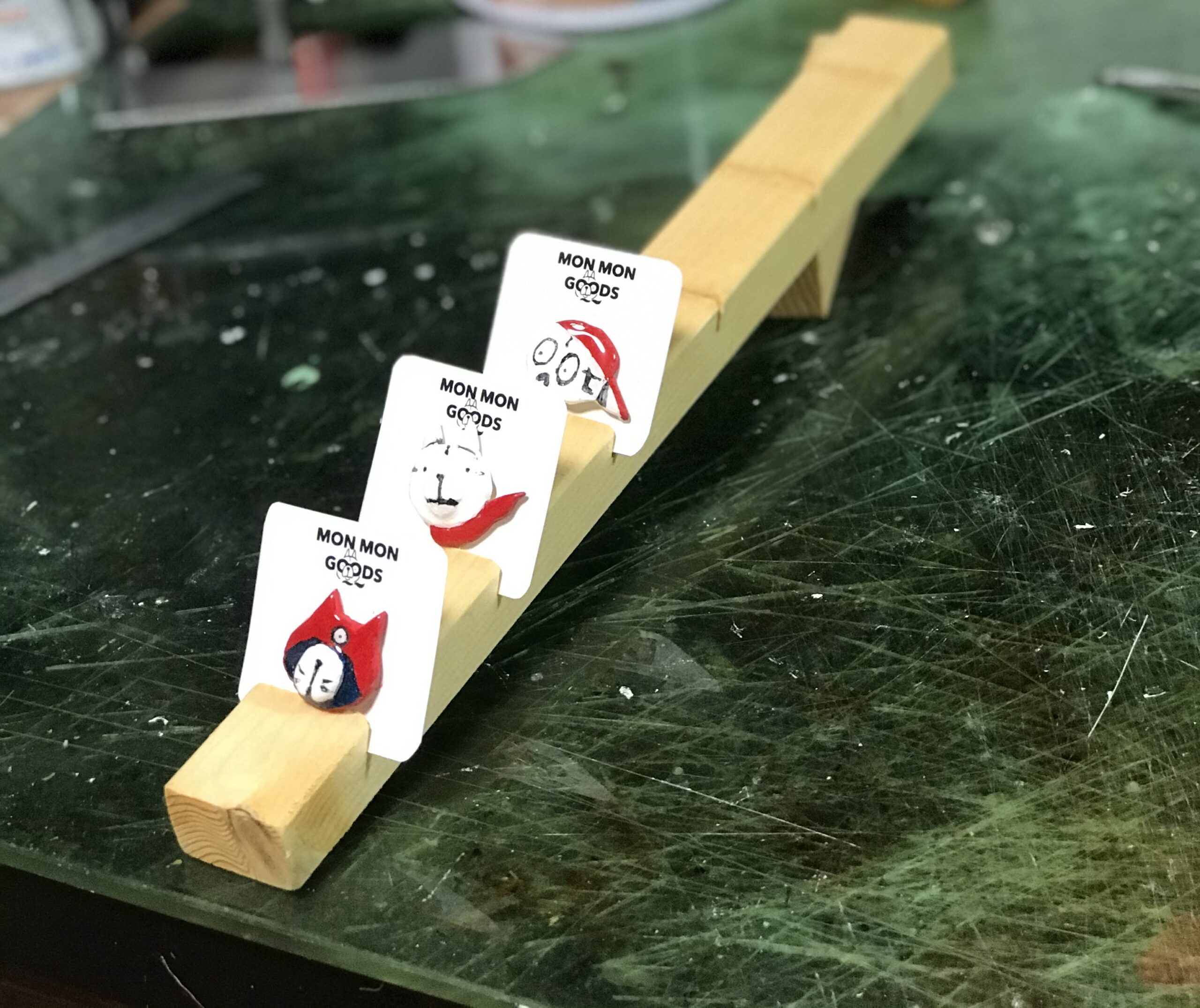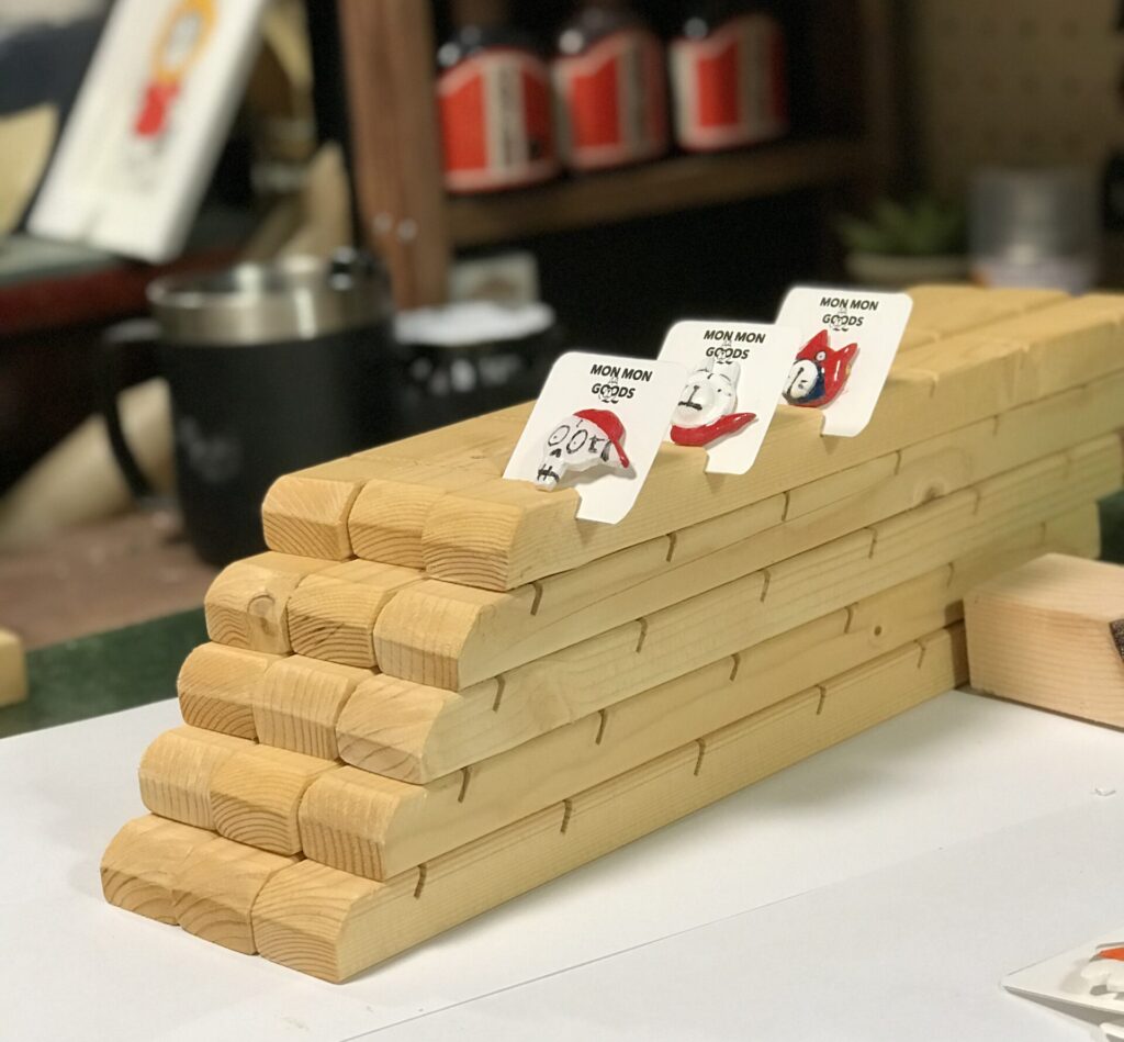 今日作っていたのがブローチを飾る展示台。シルクスクリーン以外のメイン商品で販売前からSNSでも評判が良くぼくも実際の店舗での反応をとても楽しみにしている商品。