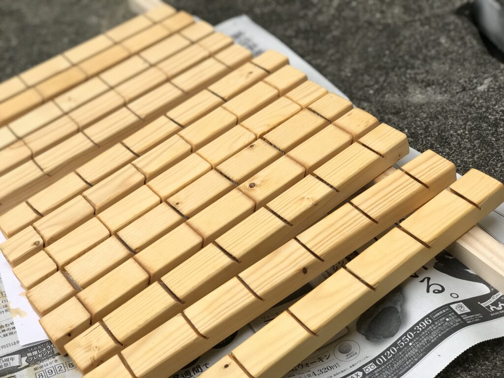 展示するにあたり、丸鋸で斜めに筋を入れ差し込むことにした。板材がなかったので角材でテスト。