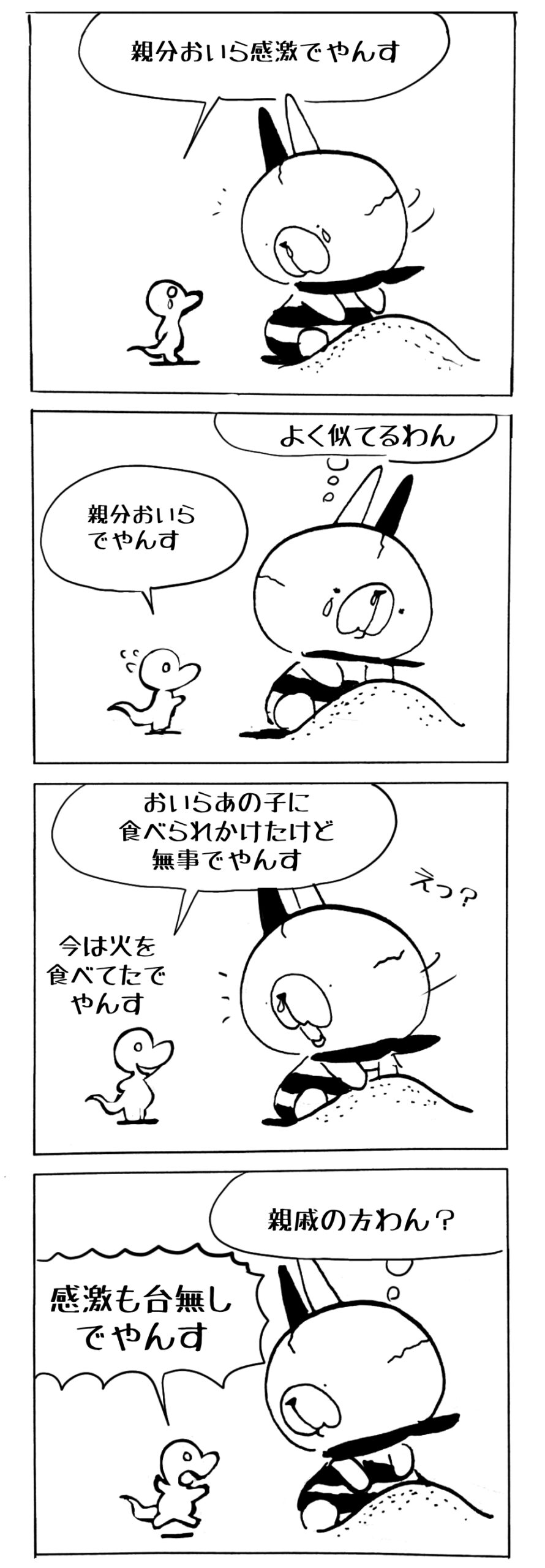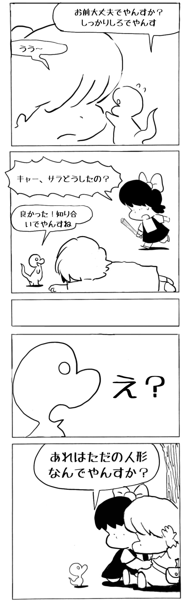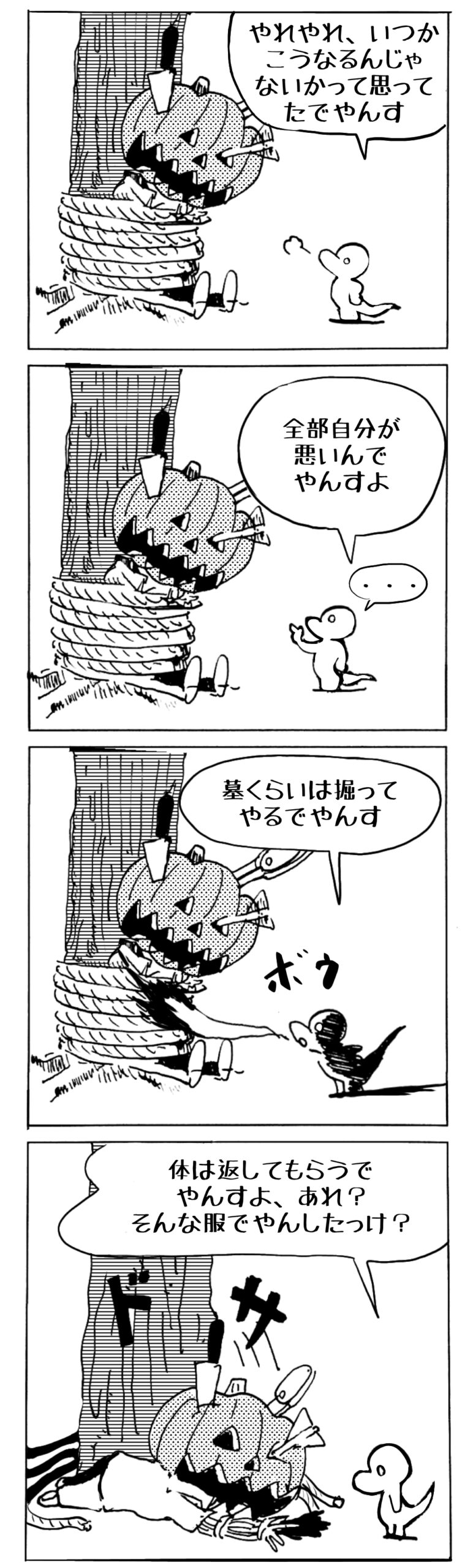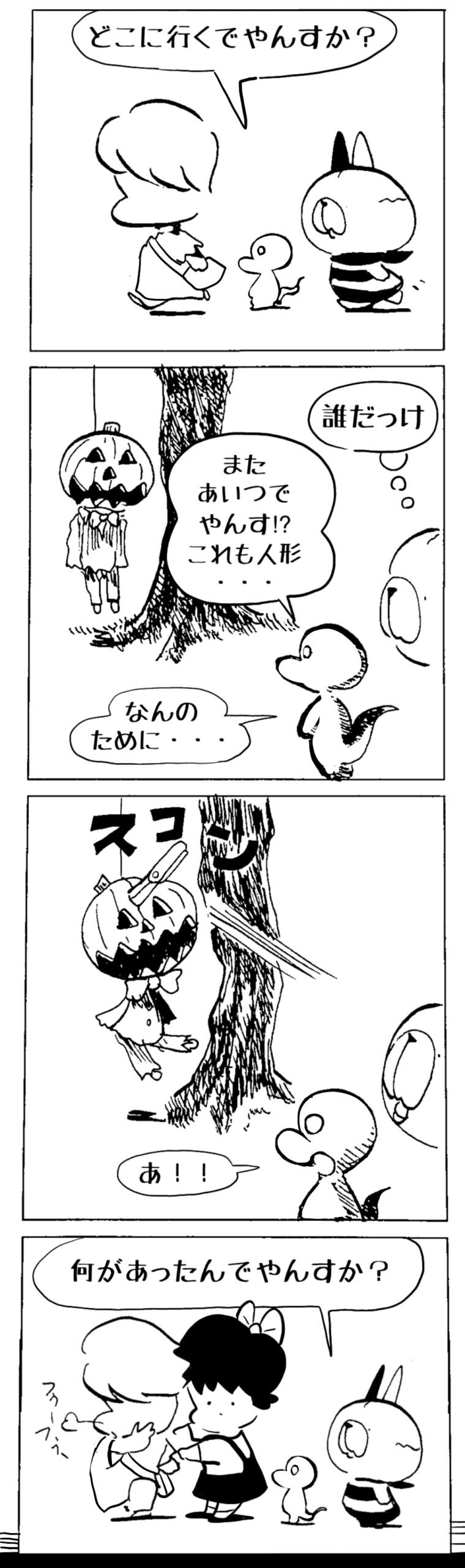 長編シリーズ pickup 【長編】パンプキングダム第一部「パンプキングダムへ」 2022年11月28日 2026年4月10日 jon covet 長編シリーズ【長編】パンプキングダム第一部「パンプキングダムへ」MON MON MONSTER長編シリーズ第七弾。 パンプキングダム第一部 スプリングウェルに突如現れ町をめちゃくちゃにする謎のカボチャ男。そして彼を狙う黒ずくめの男。ひょんなはずみでタルトとサラマンダーも二人のいざこざに巻き込まれてしまい辿り着いた場所は聞いたこともない名前の王国「パンプキングダム... 長編シリーズ【長編】パンプキングダム第二部「戦士の丘」【ここまでのあらすじ】 必死の思いで倒した騎士団長ヤギーにカムラを連れ去られてしまったタルトたち。カムラの最後の言葉は「息子を探せ」。しかし騎士団の副団長であった息子ターナーは先の戦争で亡くなっていることが判明してしまう。しかし一行は一縷の望みを託して墓の場所を知る少女達と共にターナーが眠る墓地「戦... 長編シリーズ【長編】パンプキングダム第三部「ダンの研究所」【ここまでのあらすじ】 戦士の丘で再び襲ってきた騎士団長ヤギーだったがなぜかサラのバッグを狙う盗賊ケンにより逃走に成功する。実はケンこそがカムラの双子の息子のもう一人であることが判明する。伝説のラビットルに乗り一行はひとまず身を隠すためにサラの父親ダンの研究所に向かったのであった・・・ 第三部「ダ... 長編シリーズ【長編】パンプキングダム第四部「カブリエルとユスター」 【ここまでのあらすじ】 ダンの秘密の研究所に身を隠した一行だったがなぜか騎士団に居処がバレてしまった。迫り来る騎士団をケンとマルフーで圧倒するも謎の鉄仮面の男により全滅をしてしまう。すんでのところで命を取り留めたケンと城に連れ去られたユスターたち。ジッパー君を通してユスターをが過去、そして現在に何... 長編シリーズ【長編】パンプキングダム第五部【ここまでのあらすじ】 暗躍する謎多きカボタリアン、カブリエルにより国を奪われたユスター。一人地下牢で過ごす中で時空を越える妹と同じ力を持ったノレイ王子と出会う。そして彼の力を使い現代に時間転送したのであった。 第一部「時空間転送」 第一章「騎士団長カムラ」 第二章「ノレイの覚醒」 第三章「予期せ... 長編シリーズ【長編】パンプキングダム第六部MON MON MONSTER長編シリーズ第七弾 パンプキングダム第六部 【ここまでのあらすじ】 暗躍する謎多きカボタリアン、カブリエルにより国を奪われたユスター。一人地下牢で過ごす中で時空を越える妹と同じ力を持ったノレイ王子と出会う。そして彼の力を使い現代に時間転送したのであった。 ... 長編シリーズ【長編】パンプキングダム第七部MON MON MONSTER長編シリーズ第七弾 パンプキングダム第七部 【ここまでのあらすじ】 何かを企む現パンプキングダム王ジョソウ。城に潜入したケンだったが無事皆を救出するもそこには狂科学者現騎士団科学部隊隊長のソウムが立ち塞がる。ランタンに火を灯され殺戮マシーンとなったマルフーに殴られ昔... 絵コンテ【長編】パンプキングダム第八部MON MON MONSTER長編シリーズ第七弾 パンプキングダム第八部 【ここまでのあらすじ】 戦いの中で自分がなぜ騎士団になりたかったのかを思い出したケン。伝説の名刀テスターを譲り受け親友のマルフーの動きを止めることに成功したのも束の間、和解したばかりの父の胸を怪人13号の拳が貫いた。 ... 絵コンテ【長編】パンプキングダム第九部ちMON MON MONSTER長編シリーズ第九弾 パンプキングダム第九部 【ここまでのあらすじ】 怒りに燃えるマルフーの拳が城の祝福に火をつけこのままでは大爆発を起こし大陸ごと吹き飛ばしてしまうかもしれない緊急事態に。使命を取り戻した騎士団が暴君ジョソウに反旗を翻し国民を助けるため奔走する中で死ん... 第一部「パンプキングダムへ」 第一章「黒い騎士襲来」 第二章「血のハロウィン」 第三章「カボテン山の戦い」 第四章「カボチャの王子」 第二章「血のハロウィン」 第二章「血のハロウィン」完 次のページ 1 2 3 4 Facebook Twitter はてブ Pocket Feedly
