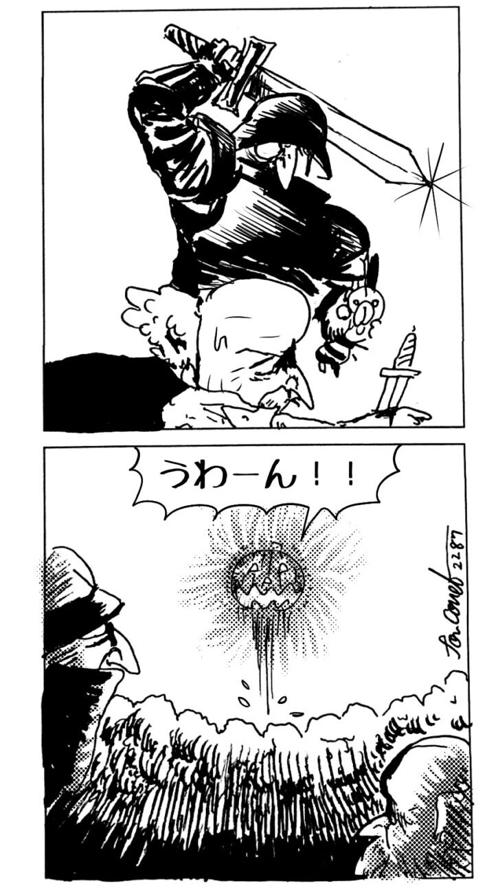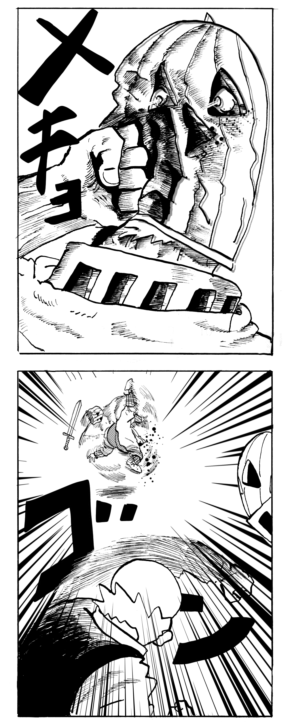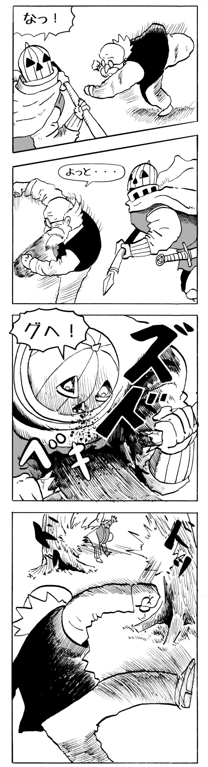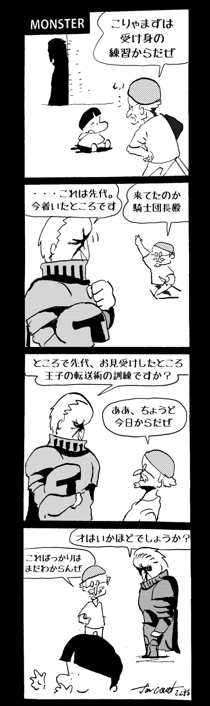長編シリーズ pickup 【長編】パンプキングダム第一部「パンプキングダムへ」 2022年11月28日 2026年4月10日 jon covet 長編シリーズ【長編】パンプキングダム第一部「パンプキングダムへ」MON MON MONSTER長編シリーズ第七弾。 パンプキングダム第一部 スプリングウェルに突如現れ町をめちゃくちゃにする謎のカボチャ男。そして彼を狙う黒ずくめの男。ひょんなはずみでタルトとサラマンダーも二人のいざこざに巻き込まれてしまい辿り着いた場所は聞いたこともない名前の王国「パンプキングダム... 長編シリーズ【長編】パンプキングダム第二部「戦士の丘」【ここまでのあらすじ】 必死の思いで倒した騎士団長ヤギーにカムラを連れ去られてしまったタルトたち。カムラの最後の言葉は「息子を探せ」。しかし騎士団の副団長であった息子ターナーは先の戦争で亡くなっていることが判明してしまう。しかし一行は一縷の望みを託して墓の場所を知る少女達と共にターナーが眠る墓地「戦... 長編シリーズ【長編】パンプキングダム第三部「ダンの研究所」【ここまでのあらすじ】 戦士の丘で再び襲ってきた騎士団長ヤギーだったがなぜかサラのバッグを狙う盗賊ケンにより逃走に成功する。実はケンこそがカムラの双子の息子のもう一人であることが判明する。伝説のラビットルに乗り一行はひとまず身を隠すためにサラの父親ダンの研究所に向かったのであった・・・ 第三部「ダ... 長編シリーズ【長編】パンプキングダム第四部「カブリエルとユスター」 【ここまでのあらすじ】 ダンの秘密の研究所に身を隠した一行だったがなぜか騎士団に居処がバレてしまった。迫り来る騎士団をケンとマルフーで圧倒するも謎の鉄仮面の男により全滅をしてしまう。すんでのところで命を取り留めたケンと城に連れ去られたユスターたち。ジッパー君を通してユスターをが過去、そして現在に何... 長編シリーズ【長編】パンプキングダム第五部【ここまでのあらすじ】 暗躍する謎多きカボタリアン、カブリエルにより国を奪われたユスター。一人地下牢で過ごす中で時空を越える妹と同じ力を持ったノレイ王子と出会う。そして彼の力を使い現代に時間転送したのであった。 第一部「時空間転送」 第一章「騎士団長カムラ」 第二章「ノレイの覚醒」 第三章「予期せ... 長編シリーズ【長編】パンプキングダム第六部MON MON MONSTER長編シリーズ第七弾 パンプキングダム第六部 【ここまでのあらすじ】 暗躍する謎多きカボタリアン、カブリエルにより国を奪われたユスター。一人地下牢で過ごす中で時空を越える妹と同じ力を持ったノレイ王子と出会う。そして彼の力を使い現代に時間転送したのであった。 ... 長編シリーズ【長編】パンプキングダム第七部MON MON MONSTER長編シリーズ第七弾 パンプキングダム第七部 【ここまでのあらすじ】 何かを企む現パンプキングダム王ジョソウ。城に潜入したケンだったが無事皆を救出するもそこには狂科学者現騎士団科学部隊隊長のソウムが立ち塞がる。ランタンに火を灯され殺戮マシーンとなったマルフーに殴られ昔... 絵コンテ【長編】パンプキングダム第八部MON MON MONSTER長編シリーズ第七弾 パンプキングダム第八部 【ここまでのあらすじ】 戦いの中で自分がなぜ騎士団になりたかったのかを思い出したケン。伝説の名刀テスターを譲り受け親友のマルフーの動きを止めることに成功したのも束の間、和解したばかりの父の胸を怪人13号の拳が貫いた。 ... 絵コンテ【長編】パンプキングダム第九部ちMON MON MONSTER長編シリーズ第九弾 パンプキングダム第九部 【ここまでのあらすじ】 怒りに燃えるマルフーの拳が城の祝福に火をつけこのままでは大爆発を起こし大陸ごと吹き飛ばしてしまうかもしれない緊急事態に。使命を取り戻した騎士団が暴君ジョソウに反旗を翻し国民を助けるため奔走する中で死ん... 第一部「パンプキングダムへ」 第一章「黒い騎士襲来」 第二章「血のハロウィン」 第三章「カボテン山の戦い」 第四章「カボチャの王子」 第三章「カボテン山の戦い」 第三章「カボテン山の戦い」 次のページ 1 2 3 4 Facebook Twitter はてブ Pocket Feedly