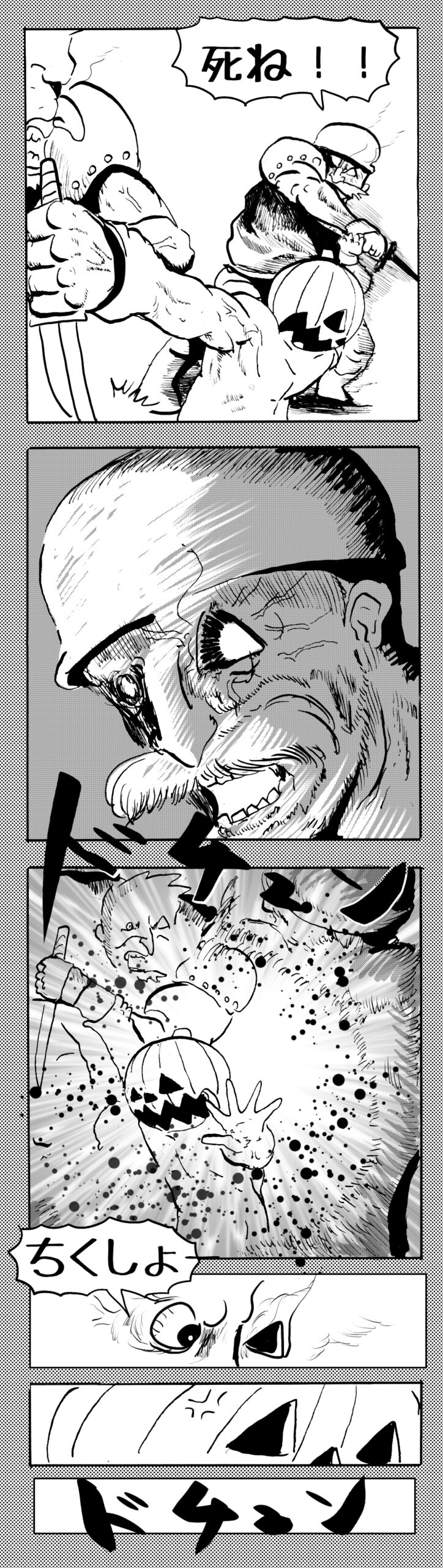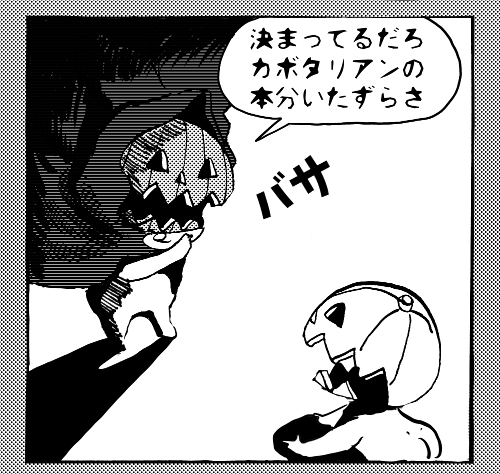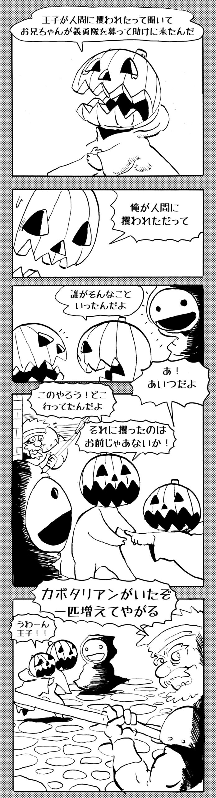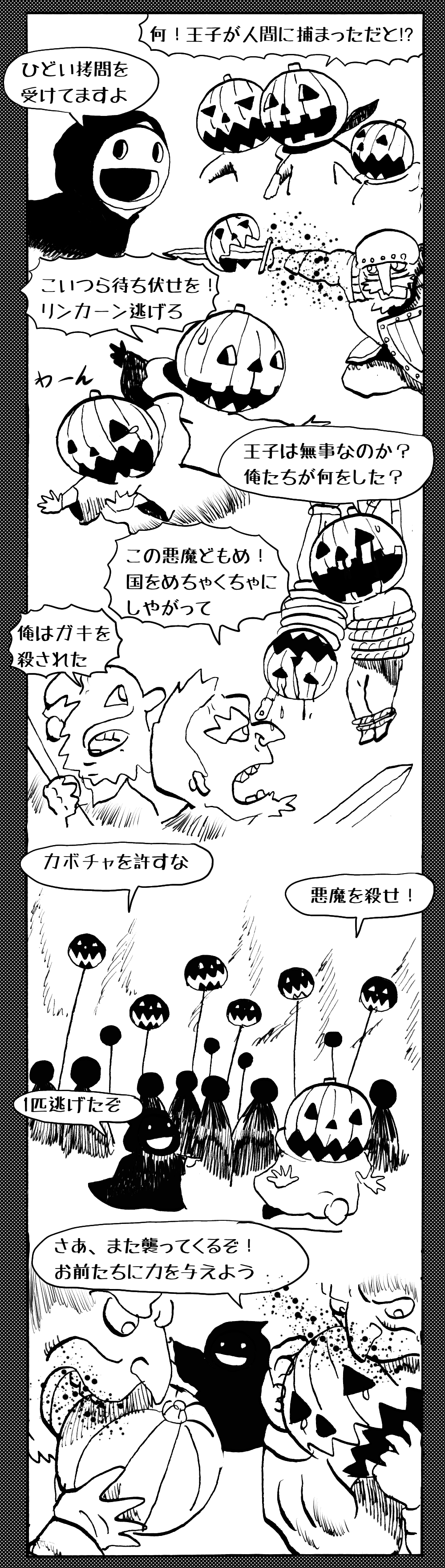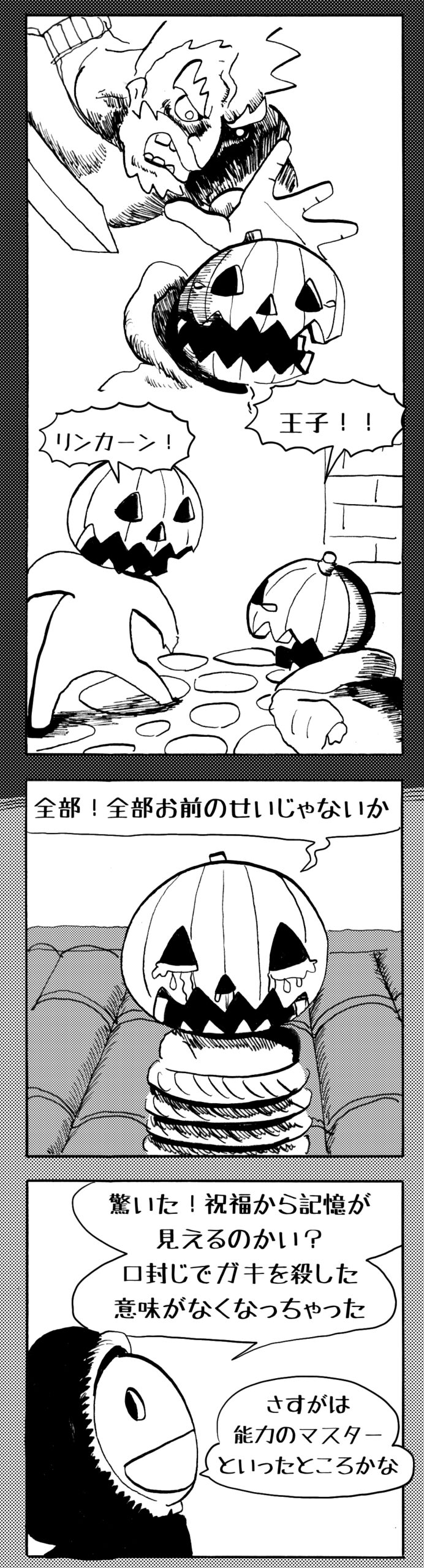 長編シリーズ 【長編】パンプキングダム第四部「カブリエルとユスター」 2023年12月13日 2025年10月11日 jon covet 長編シリーズ【長編】パンプキングダム第一部「パンプキングダムへ」MON MON MONSTER長編シリーズ第七弾。 パンプキングダム第一部 スプリングウェルに突如現れ町をめちゃくちゃにする謎のカボチャ男。そして彼を狙う黒ずくめの男。ひょんなはずみでタルトとサラマンダーも二人のいざこざに巻き込まれてしまい辿り着いた場所は聞いたこともない名前の王国「パンプキングダム... 長編シリーズ【長編】パンプキングダム第二部「戦士の丘」【ここまでのあらすじ】 必死の思いで倒した騎士団長ヤギーにカムラを連れ去られてしまったタルトたち。カムラの最後の言葉は「息子を探せ」。しかし騎士団の副団長であった息子ターナーは先の戦争で亡くなっていることが判明してしまう。しかし一行は一縷の望みを託して墓の場所を知る少女達と共にターナーが眠る墓地「戦... 長編シリーズ【長編】パンプキングダム第三部「ダンの研究所」【ここまでのあらすじ】 戦士の丘で再び襲ってきた騎士団長ヤギーだったがなぜかサラのバッグを狙う盗賊ケンにより逃走に成功する。実はケンこそがカムラの双子の息子のもう一人であることが判明する。伝説のラビットルに乗り一行はひとまず身を隠すためにサラの父親ダンの研究所に向かったのであった・・・ 第三部「ダ... 長編シリーズ【長編】パンプキングダム第四部「カブリエルとユスター」 【ここまでのあらすじ】 ダンの秘密の研究所に身を隠した一行だったがなぜか騎士団に居処がバレてしまった。迫り来る騎士団をケンとマルフーで圧倒するも謎の鉄仮面の男により全滅をしてしまう。すんでのところで命を取り留めたケンと城に連れ去られたユスターたち。ジッパー君を通してユスターをが過去、そして現在に何... 長編シリーズ【長編】パンプキングダム第五部【ここまでのあらすじ】 暗躍する謎多きカボタリアン、カブリエルにより国を奪われたユスター。一人地下牢で過ごす中で時空を越える妹と同じ力を持ったノレイ王子と出会う。そして彼の力を使い現代に時間転送したのであった。 第一部「時空間転送」 第一章「騎士団長カムラ」 第二章「ノレイの覚醒」 第三章「予期せ... 長編シリーズ【長編】パンプキングダム第六部MON MON MONSTER長編シリーズ第七弾 パンプキングダム第六部 【ここまでのあらすじ】 暗躍する謎多きカボタリアン、カブリエルにより国を奪われたユスター。一人地下牢で過ごす中で時空を越える妹と同じ力を持ったノレイ王子と出会う。そして彼の力を使い現代に時間転送したのであった。 ... 長編シリーズ【長編】パンプキングダム第七部MON MON MONSTER長編シリーズ第七弾 パンプキングダム第七部 【ここまでのあらすじ】 何かを企む現パンプキングダム王ジョソウ。城に潜入したケンだったが無事皆を救出するもそこには狂科学者現騎士団科学部隊隊長のソウムが立ち塞がる。ランタンに火を灯され殺戮マシーンとなったマルフーに殴られ昔... 絵コンテ【長編】パンプキングダム第八部MON MON MONSTER長編シリーズ第七弾 パンプキングダム第八部 【ここまでのあらすじ】 戦いの中で自分がなぜ騎士団になりたかったのかを思い出したケン。伝説の名刀テスターを譲り受け親友のマルフーの動きを止めることに成功したのも束の間、和解したばかりの父の胸を怪人13号の拳が貫いた。 ... 絵コンテ【長編】パンプキングダム第九部ちMON MON MONSTER長編シリーズ第九弾 パンプキングダム第九部 【ここまでのあらすじ】 怒りに燃えるマルフーの拳が城の祝福に火をつけこのままでは大爆発を起こし大陸ごと吹き飛ばしてしまうかもしれない緊急事態に。使命を取り戻した騎士団が暴君ジョソウに反旗を翻し国民を助けるため奔走する中で死ん... 第4部「カブリエル」 第一章「戦士長オービット」 第二章「戦争」 第三章「神話の力」 第四章「未来へ」 第二章「戦争」 第二章「戦争」完 次のページ 1 2 3 4 Facebook Twitter はてブ Pocket Feedly