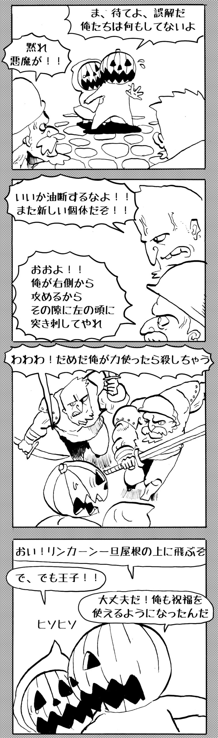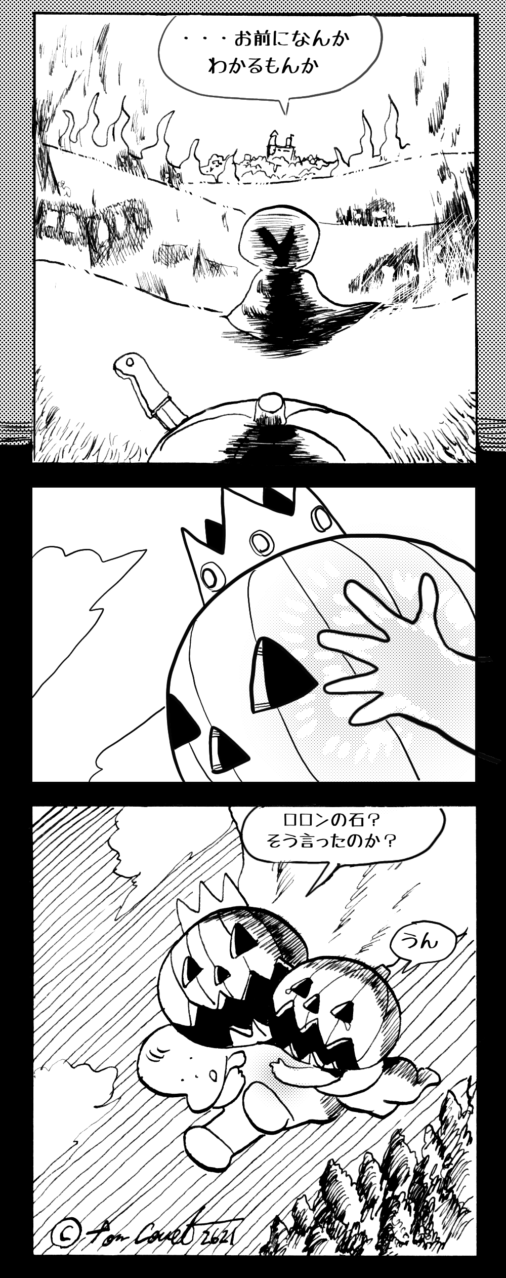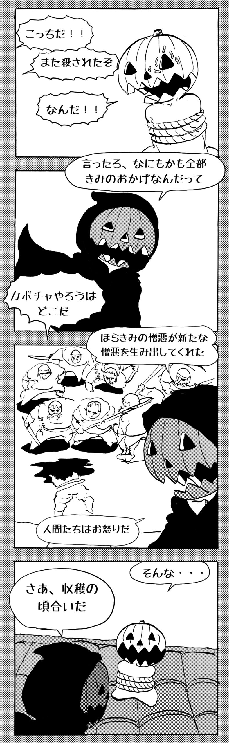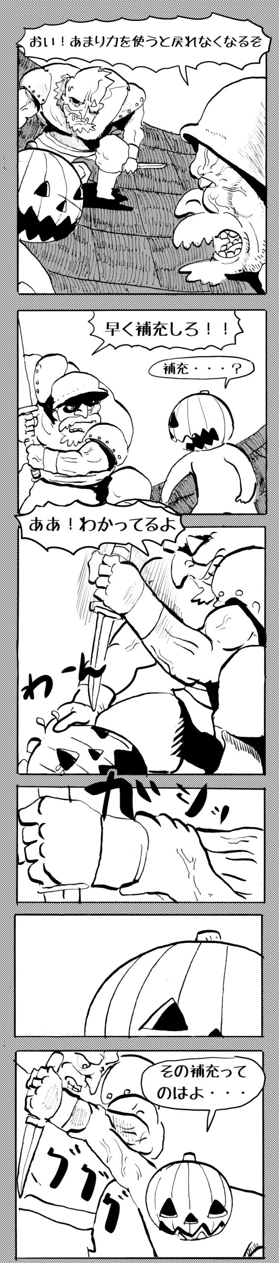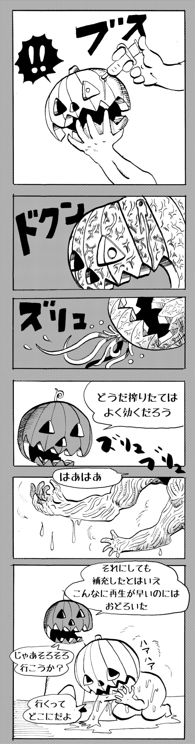 長編シリーズ 【長編】パンプキングダム第四部「カブリエルとユスター」 2023年12月13日 2025年10月11日 jon covet 長編シリーズ【長編】パンプキングダム第一部「パンプキングダムへ」MON MON MONSTER長編シリーズ第七弾。 パンプキングダム第一部 スプリングウェルに突如現れ町をめちゃくちゃにする謎のカボチャ男。そして彼を狙う黒ずくめの男。ひょんなはずみでタルトとサラマンダーも二人のいざこざに巻き込まれてしまい辿り着いた場所は聞いたこともない名前の王国「パンプキングダム... 長編シリーズ【長編】パンプキングダム第二部「戦士の丘」【ここまでのあらすじ】 必死の思いで倒した騎士団長ヤギーにカムラを連れ去られてしまったタルトたち。カムラの最後の言葉は「息子を探せ」。しかし騎士団の副団長であった息子ターナーは先の戦争で亡くなっていることが判明してしまう。しかし一行は一縷の望みを託して墓の場所を知る少女達と共にターナーが眠る墓地「戦... 長編シリーズ【長編】パンプキングダム第三部「ダンの研究所」【ここまでのあらすじ】 戦士の丘で再び襲ってきた騎士団長ヤギーだったがなぜかサラのバッグを狙う盗賊ケンにより逃走に成功する。実はケンこそがカムラの双子の息子のもう一人であることが判明する。伝説のラビットルに乗り一行はひとまず身を隠すためにサラの父親ダンの研究所に向かったのであった・・・ 第三部「ダ... 長編シリーズ【長編】パンプキングダム第四部「カブリエルとユスター」 【ここまでのあらすじ】 ダンの秘密の研究所に身を隠した一行だったがなぜか騎士団に居処がバレてしまった。迫り来る騎士団をケンとマルフーで圧倒するも謎の鉄仮面の男により全滅をしてしまう。すんでのところで命を取り留めたケンと城に連れ去られたユスターたち。ジッパー君を通してユスターをが過去、そして現在に何... 長編シリーズ【長編】パンプキングダム第五部【ここまでのあらすじ】 暗躍する謎多きカボタリアン、カブリエルにより国を奪われたユスター。一人地下牢で過ごす中で時空を越える妹と同じ力を持ったノレイ王子と出会う。そして彼の力を使い現代に時間転送したのであった。 第一部「時空間転送」 第一章「騎士団長カムラ」 第二章「ノレイの覚醒」 第三章「予期せ... 長編シリーズ【長編】パンプキングダム第六部MON MON MONSTER長編シリーズ第七弾 パンプキングダム第六部 【ここまでのあらすじ】 暗躍する謎多きカボタリアン、カブリエルにより国を奪われたユスター。一人地下牢で過ごす中で時空を越える妹と同じ力を持ったノレイ王子と出会う。そして彼の力を使い現代に時間転送したのであった。 ... 長編シリーズ【長編】パンプキングダム第七部MON MON MONSTER長編シリーズ第七弾 パンプキングダム第七部 【ここまでのあらすじ】 何かを企む現パンプキングダム王ジョソウ。城に潜入したケンだったが無事皆を救出するもそこには狂科学者現騎士団科学部隊隊長のソウムが立ち塞がる。ランタンに火を灯され殺戮マシーンとなったマルフーに殴られ昔... 絵コンテ【長編】パンプキングダム第八部MON MON MONSTER長編シリーズ第七弾 パンプキングダム第八部 【ここまでのあらすじ】 戦いの中で自分がなぜ騎士団になりたかったのかを思い出したケン。伝説の名刀テスターを譲り受け親友のマルフーの動きを止めることに成功したのも束の間、和解したばかりの父の胸を怪人13号の拳が貫いた。 ... 絵コンテ【長編】パンプキングダム第九部ちMON MON MONSTER長編シリーズ第九弾 パンプキングダム第九部 【ここまでのあらすじ】 怒りに燃えるマルフーの拳が城の祝福に火をつけこのままでは大爆発を起こし大陸ごと吹き飛ばしてしまうかもしれない緊急事態に。使命を取り戻した騎士団が暴君ジョソウに反旗を翻し国民を助けるため奔走する中で死ん... 第4部「カブリエル」 第一章「戦士長オービット」 第二章「戦争」 第三章「神話の力」 第四章「未来へ」 第二章「戦争」 第二章「戦争」完 次のページ 1 2 3 4 Facebook Twitter はてブ Pocket Feedly
