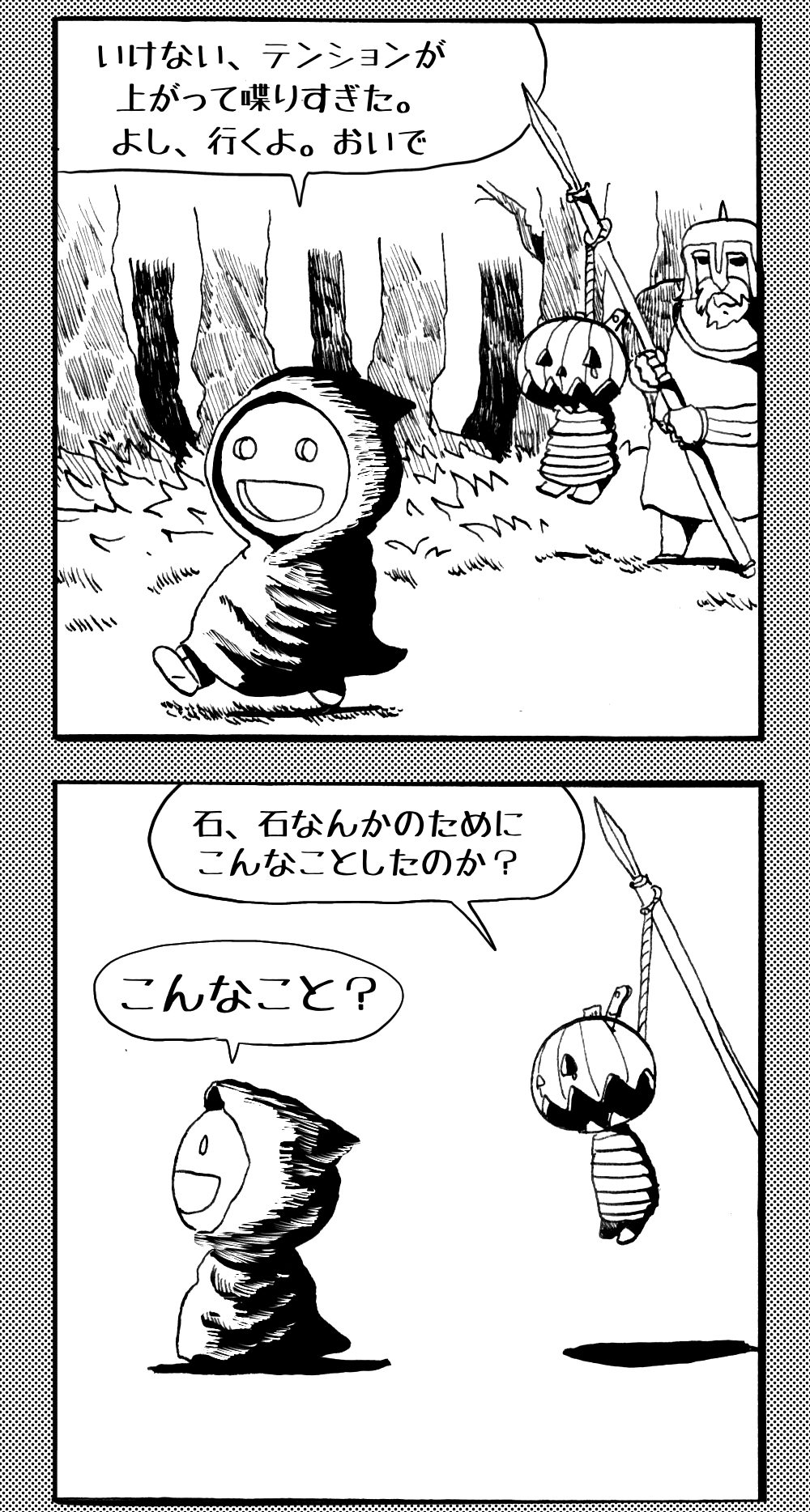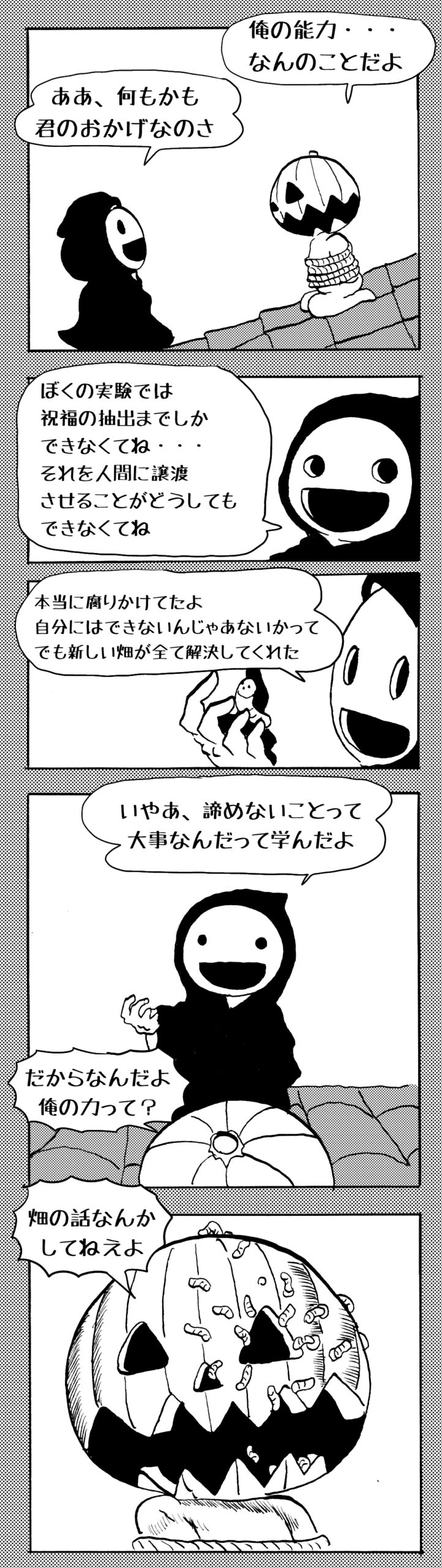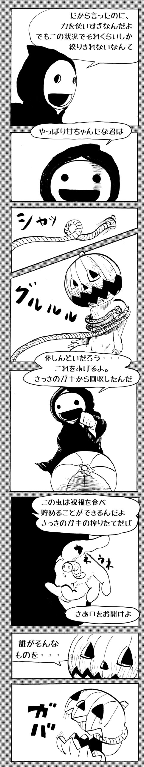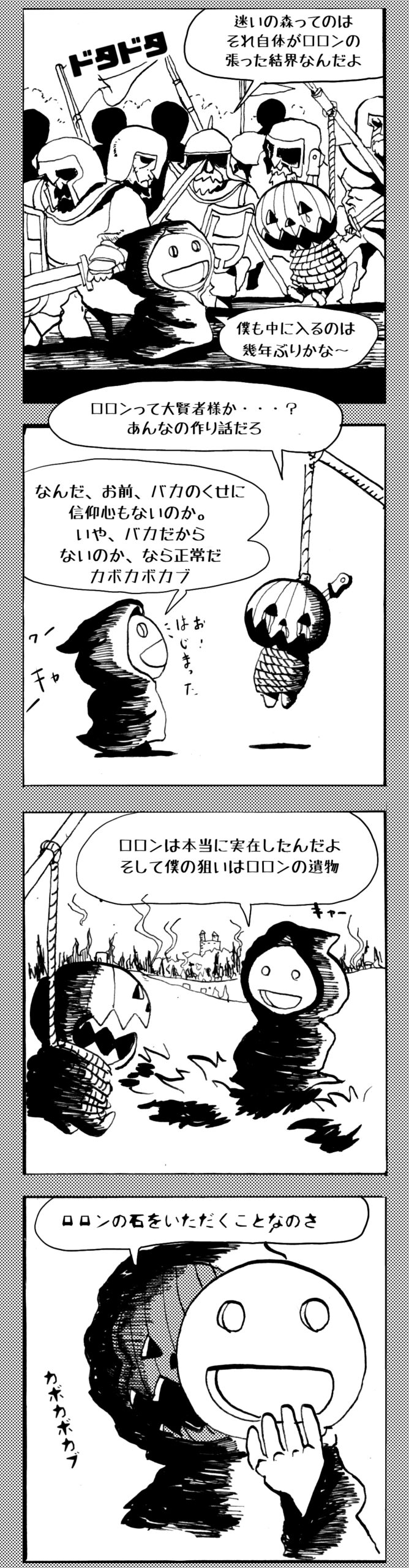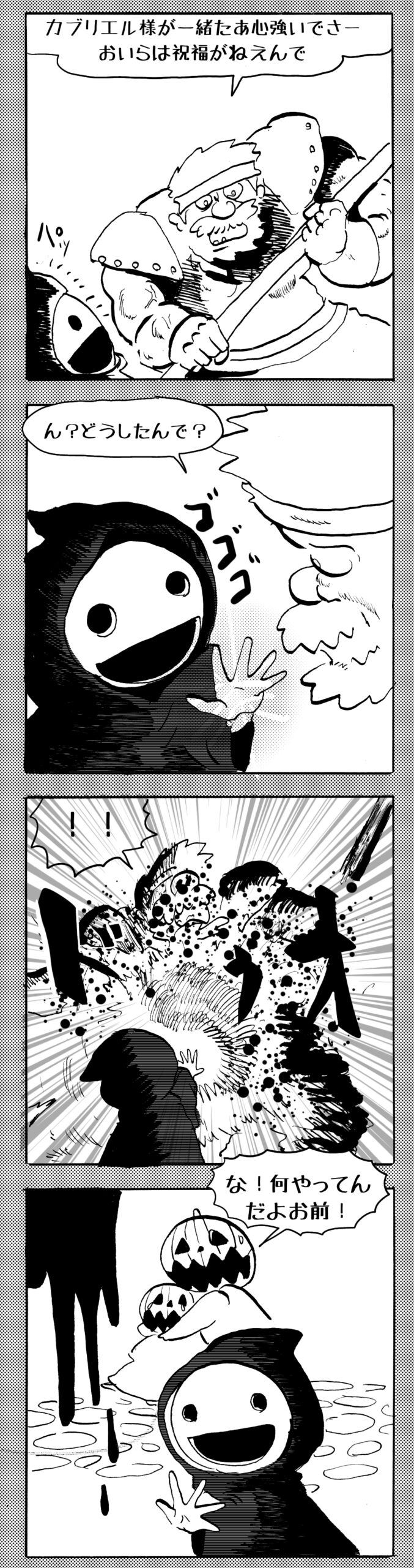長編シリーズ 【長編】パンプキングダム第四部「カブリエルとユスター」 2023年12月13日 2025年10月11日 jon covet 長編シリーズ【長編】パンプキングダム第一部「パンプキングダムへ」MON MON MONSTER長編シリーズ第七弾。 パンプキングダム第一部 スプリングウェルに突如現れ町をめちゃくちゃにする謎のカボチャ男。そして彼を狙う黒ずくめの男。ひょんなはずみでタルトとサラマンダーも二人のいざこざに巻き込まれてしまい辿り着いた場所は聞いたこともない名前の王国「パンプキングダム... 長編シリーズ【長編】パンプキングダム第二部「戦士の丘」【ここまでのあらすじ】 必死の思いで倒した騎士団長ヤギーにカムラを連れ去られてしまったタルトたち。カムラの最後の言葉は「息子を探せ」。しかし騎士団の副団長であった息子ターナーは先の戦争で亡くなっていることが判明してしまう。しかし一行は一縷の望みを託して墓の場所を知る少女達と共にターナーが眠る墓地「戦... 長編シリーズ【長編】パンプキングダム第三部「ダンの研究所」【ここまでのあらすじ】 戦士の丘で再び襲ってきた騎士団長ヤギーだったがなぜかサラのバッグを狙う盗賊ケンにより逃走に成功する。実はケンこそがカムラの双子の息子のもう一人であることが判明する。伝説のラビットルに乗り一行はひとまず身を隠すためにサラの父親ダンの研究所に向かったのであった・・・ 第三部「ダ... 長編シリーズ【長編】パンプキングダム第四部「カブリエルとユスター」 【ここまでのあらすじ】 ダンの秘密の研究所に身を隠した一行だったがなぜか騎士団に居処がバレてしまった。迫り来る騎士団をケンとマルフーで圧倒するも謎の鉄仮面の男により全滅をしてしまう。すんでのところで命を取り留めたケンと城に連れ去られたユスターたち。ジッパー君を通してユスターをが過去、そして現在に何... 長編シリーズ【長編】パンプキングダム第五部【ここまでのあらすじ】 暗躍する謎多きカボタリアン、カブリエルにより国を奪われたユスター。一人地下牢で過ごす中で時空を越える妹と同じ力を持ったノレイ王子と出会う。そして彼の力を使い現代に時間転送したのであった。 第一部「時空間転送」 第一章「騎士団長カムラ」 第二章「ノレイの覚醒」 第三章「予期せ... 長編シリーズ【長編】パンプキングダム第六部MON MON MONSTER長編シリーズ第七弾 パンプキングダム第六部 【ここまでのあらすじ】 暗躍する謎多きカボタリアン、カブリエルにより国を奪われたユスター。一人地下牢で過ごす中で時空を越える妹と同じ力を持ったノレイ王子と出会う。そして彼の力を使い現代に時間転送したのであった。 ... 長編シリーズ【長編】パンプキングダム第七部MON MON MONSTER長編シリーズ第七弾 パンプキングダム第七部 【ここまでのあらすじ】 何かを企む現パンプキングダム王ジョソウ。城に潜入したケンだったが無事皆を救出するもそこには狂科学者現騎士団科学部隊隊長のソウムが立ち塞がる。ランタンに火を灯され殺戮マシーンとなったマルフーに殴られ昔... 絵コンテ【長編】パンプキングダム第八部MON MON MONSTER長編シリーズ第七弾 パンプキングダム第八部 【ここまでのあらすじ】 戦いの中で自分がなぜ騎士団になりたかったのかを思い出したケン。伝説の名刀テスターを譲り受け親友のマルフーの動きを止めることに成功したのも束の間、和解したばかりの父の胸を怪人13号の拳が貫いた。 ... 絵コンテ【長編】パンプキングダム第九部ちMON MON MONSTER長編シリーズ第九弾 パンプキングダム第九部 【ここまでのあらすじ】 怒りに燃えるマルフーの拳が城の祝福に火をつけこのままでは大爆発を起こし大陸ごと吹き飛ばしてしまうかもしれない緊急事態に。使命を取り戻した騎士団が暴君ジョソウに反旗を翻し国民を助けるため奔走する中で死ん... 第4部「カブリエル」 第一章「戦士長オービット」 第二章「戦争」 第三章「神話の力」 第四章「未来へ」 第二章「戦争」 第二章「戦争」完 次のページ 1 2 3 4 Facebook Twitter はてブ Pocket Feedly