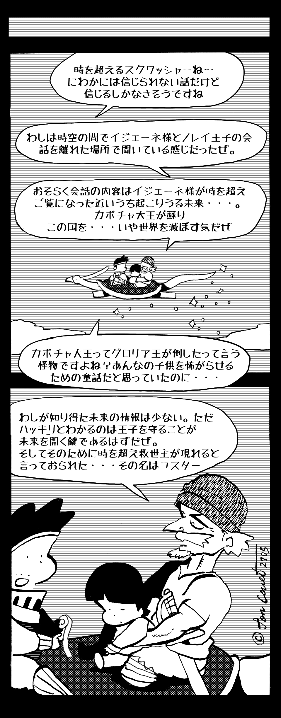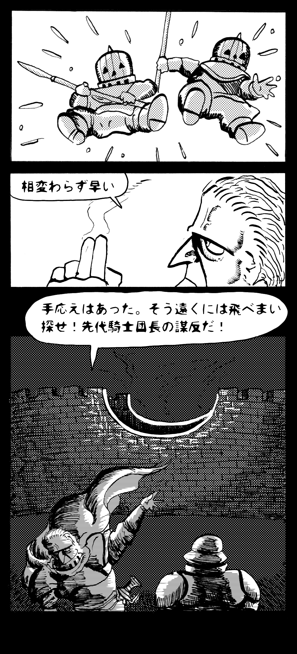長編シリーズ 【長編】パンプキングダム第五部 2024年3月21日 2025年10月25日 jon covet 長編シリーズ【長編】パンプキングダム第一部「パンプキングダムへ」MON MON MONSTER長編シリーズ第七弾。 パンプキングダム第一部 スプリングウェルに突如現れ町をめちゃくちゃにする謎のカボチャ男。そして彼を狙う黒ずくめの男。ひょんなはずみでタルトとサラマンダーも二人のいざこざに巻き込まれてしまい辿り着いた場所は聞いたこともない名前の王国「パンプキングダム... 長編シリーズ【長編】パンプキングダム第二部「戦士の丘」【ここまでのあらすじ】 必死の思いで倒した騎士団長ヤギーにカムラを連れ去られてしまったタルトたち。カムラの最後の言葉は「息子を探せ」。しかし騎士団の副団長であった息子ターナーは先の戦争で亡くなっていることが判明してしまう。しかし一行は一縷の望みを託して墓の場所を知る少女達と共にターナーが眠る墓地「戦... 長編シリーズ【長編】パンプキングダム第三部「ダンの研究所」【ここまでのあらすじ】 戦士の丘で再び襲ってきた騎士団長ヤギーだったがなぜかサラのバッグを狙う盗賊ケンにより逃走に成功する。実はケンこそがカムラの双子の息子のもう一人であることが判明する。伝説のラビットルに乗り一行はひとまず身を隠すためにサラの父親ダンの研究所に向かったのであった・・・ 第三部「ダ... 長編シリーズ【長編】パンプキングダム第四部「カブリエルとユスター」 【ここまでのあらすじ】 ダンの秘密の研究所に身を隠した一行だったがなぜか騎士団に居処がバレてしまった。迫り来る騎士団をケンとマルフーで圧倒するも謎の鉄仮面の男により全滅をしてしまう。すんでのところで命を取り留めたケンと城に連れ去られたユスターたち。ジッパー君を通してユスターをが過去、そして現在に何... 長編シリーズ【長編】パンプキングダム第五部【ここまでのあらすじ】 暗躍する謎多きカボタリアン、カブリエルにより国を奪われたユスター。一人地下牢で過ごす中で時空を越える妹と同じ力を持ったノレイ王子と出会う。そして彼の力を使い現代に時間転送したのであった。 第一部「時空間転送」 第一章「騎士団長カムラ」 第二章「ノレイの覚醒」 第三章「予期せ... 長編シリーズ【長編】パンプキングダム第六部MON MON MONSTER長編シリーズ第七弾 パンプキングダム第六部 【ここまでのあらすじ】 暗躍する謎多きカボタリアン、カブリエルにより国を奪われたユスター。一人地下牢で過ごす中で時空を越える妹と同じ力を持ったノレイ王子と出会う。そして彼の力を使い現代に時間転送したのであった。 ... 長編シリーズ【長編】パンプキングダム第七部MON MON MONSTER長編シリーズ第七弾 パンプキングダム第七部 【ここまでのあらすじ】 何かを企む現パンプキングダム王ジョソウ。城に潜入したケンだったが無事皆を救出するもそこには狂科学者現騎士団科学部隊隊長のソウムが立ち塞がる。ランタンに火を灯され殺戮マシーンとなったマルフーに殴られ昔... 絵コンテ【長編】パンプキングダム第八部MON MON MONSTER長編シリーズ第七弾 パンプキングダム第八部 【ここまでのあらすじ】 戦いの中で自分がなぜ騎士団になりたかったのかを思い出したケン。伝説の名刀テスターを譲り受け親友のマルフーの動きを止めることに成功したのも束の間、和解したばかりの父の胸を怪人13号の拳が貫いた。 ... 絵コンテ【長編】パンプキングダム第九部ちMON MON MONSTER長編シリーズ第九弾 パンプキングダム第九部 【ここまでのあらすじ】 怒りに燃えるマルフーの拳が城の祝福に火をつけこのままでは大爆発を起こし大陸ごと吹き飛ばしてしまうかもしれない緊急事態に。使命を取り戻した騎士団が暴君ジョソウに反旗を翻し国民を助けるため奔走する中で死ん... 第一部「時空間転送」 第一章「騎士団長カムラ」 第二章「ノレイの覚醒」 第三章「予期せぬ来訪」 第四章「城内への転送」 第一章「ノレイの覚醒」 第二章「ノレイの覚醒」完 次のページ 1 2 3 4 Facebook Twitter はてブ Pocket Feedly