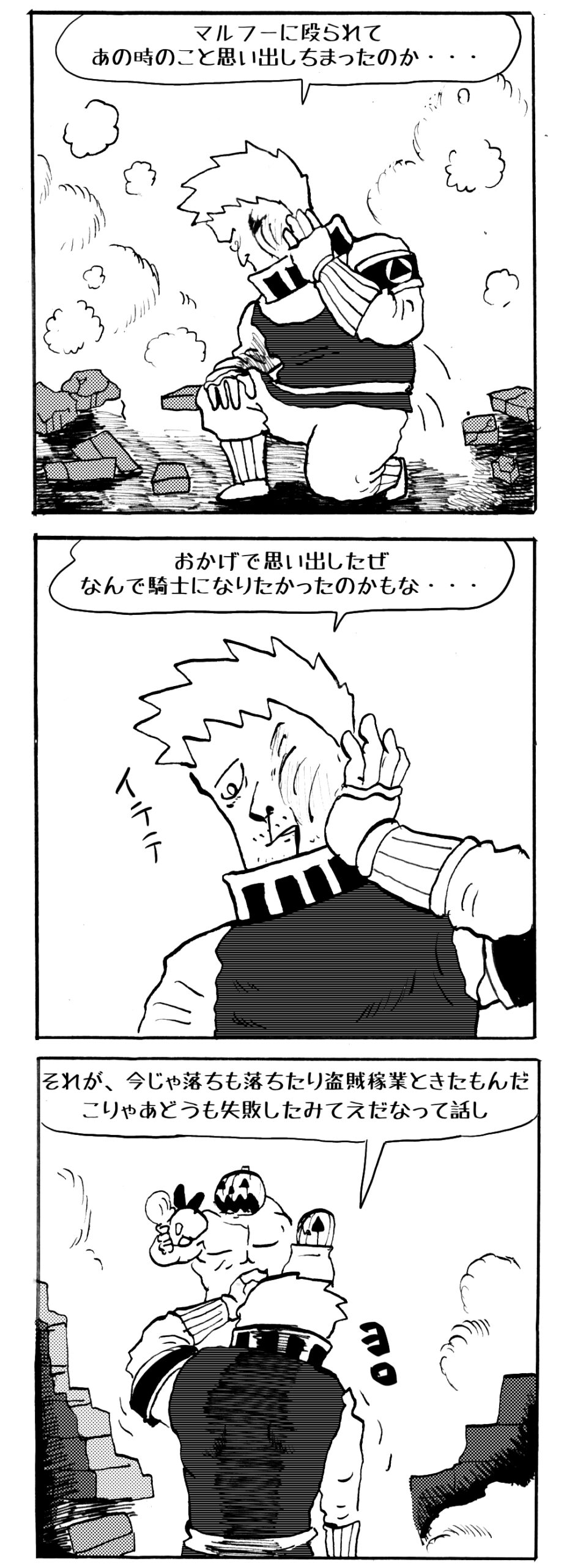 何かを企む現パンプキングダム王ジョソウ。城に潜入したケンだったが無事皆を救出するもそこには狂科学者現騎士団科学部隊隊長のソウムが立ち塞がる。ランタンに火を灯され殺戮マシーンとなったマルフーに殴られ昔の記憶を思い出すケンであった。
